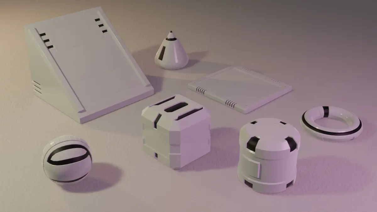 7 shapes available in FBX, Collida, MTL, and x3d.It's great building blocks to add to your scene. Basic sci-fi shapes. It's quite versatile, can do a lot of stuff with it.You can use them in games or use the 3D printer and print them out.The scene is included, also an unmodified version of the file is included too.
