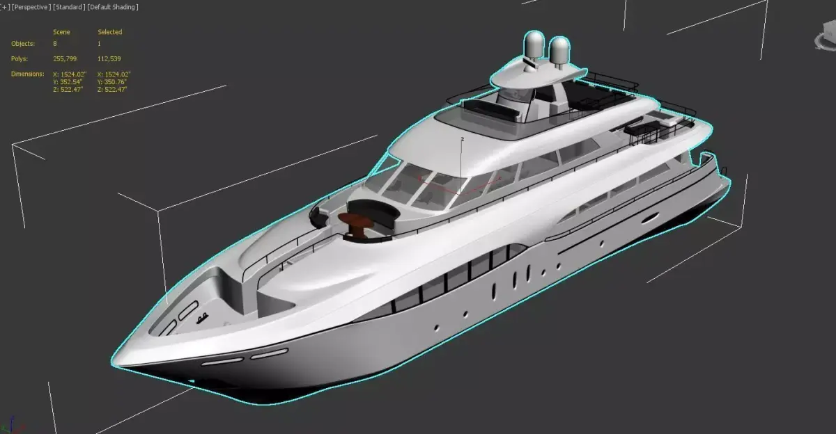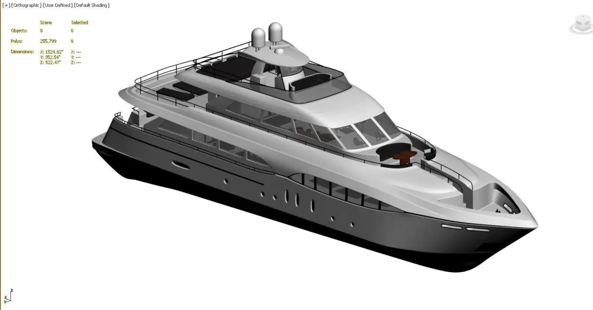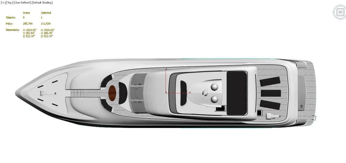 Triple-deck layout with spacious main salon, upper sky lounge, and top sun deck with radar arch and domesLarge wrap-around windows for abundant natural light and stunning viewsMultiple outdoor areas including aft deck seating, bow lounge, and upper flybridge with helm stationRealistic details such as stainless steel railings, teak accents, antennas, and navigation lightsStreamlined hull with deep blue waterline stripe for an elegant modern appearance