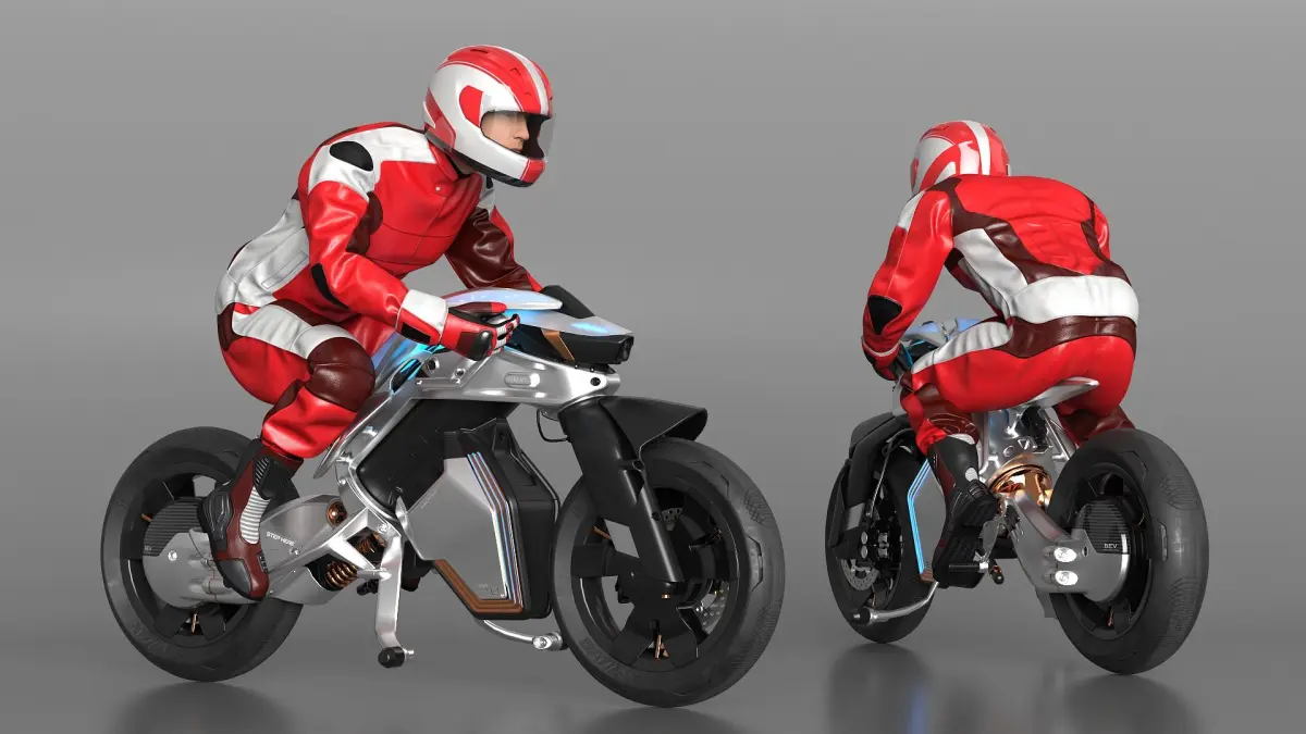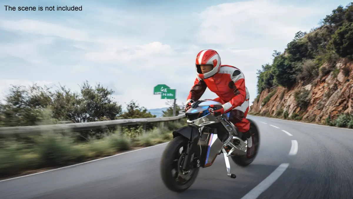 Yamaha MOTOROiD 2 Motorcycle with Biker is a three-dimensional model of male motorbike rider with advanced autonomous motorcycle prototype (biometric motorbike concept), showcasing Yamaha's futuristic design and AI-driven technology.