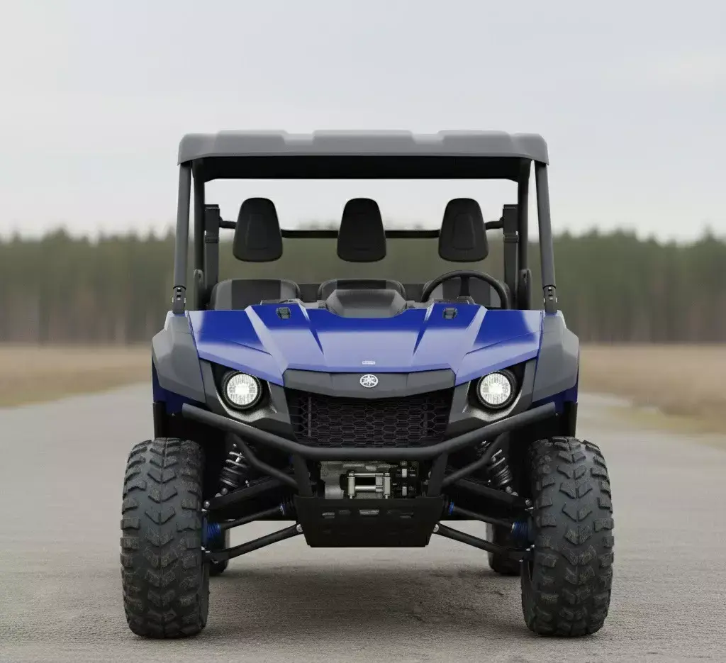 The vehicle is captured from a slightly low, front three-quarter angle, emphasizing its sturdy construction and readiness for various terrains. Its vibrant blue body panels are contrasted effectively by the black roof, roll cage, and undercarriage components, giving it a practical yet stylish appearance. The prominent front grille and powerful round headlights suggest capability and visibility.