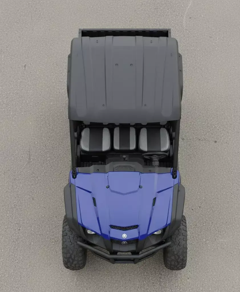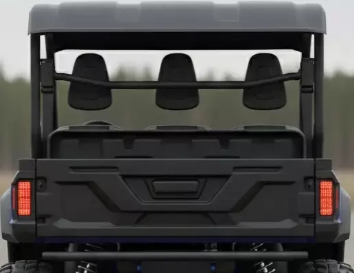 Equipped with aggressive, knobby tires and a visible suspension system, the Rhino appears well-prepared for off-road adventures and demanding work tasks. The spacious two-row seating configuration, with distinct grey and black upholstered seats, indicates its capacity to comfortably transport multiple passengers. A small utility bed is visible at the rear, hinting at its cargo-carrying capabilities. The minimalist natural setting allows the vehicle to stand out, highlighting its design without distraction. The overall impression is one of durability, reliable performance, and a perfect companion for outdoor utility or recreational activities.
