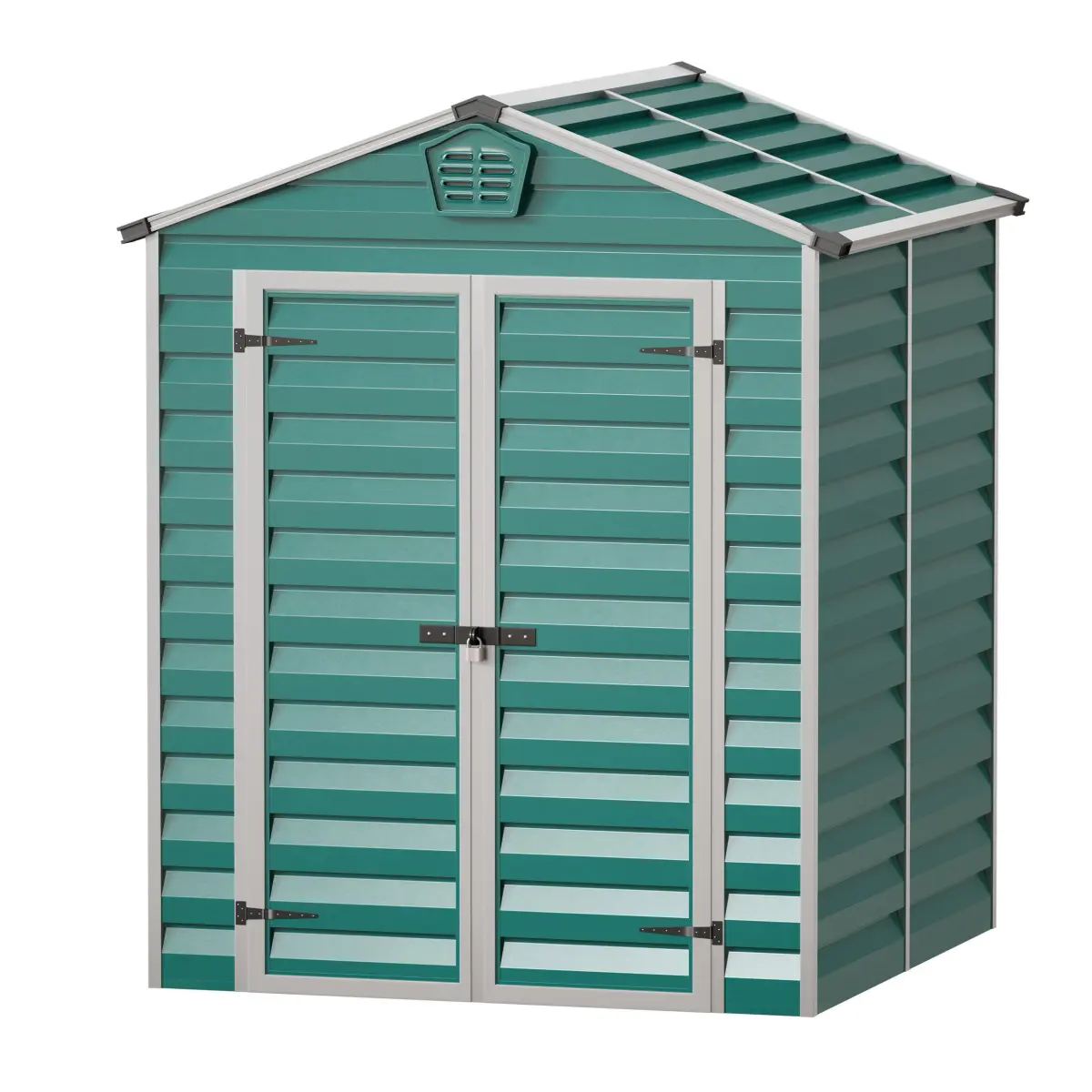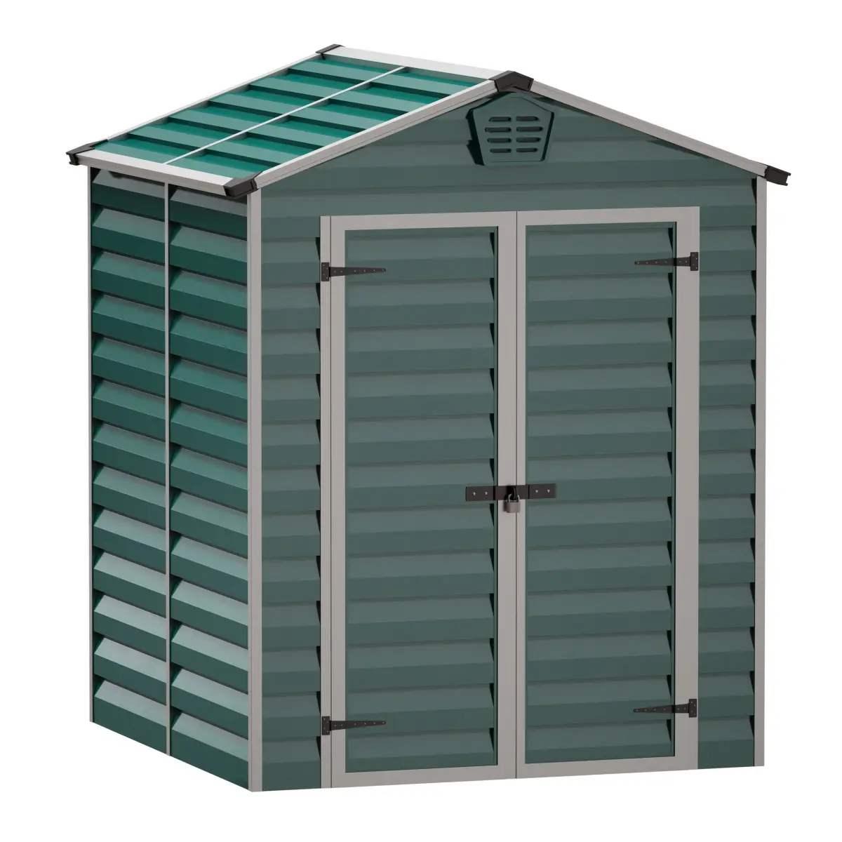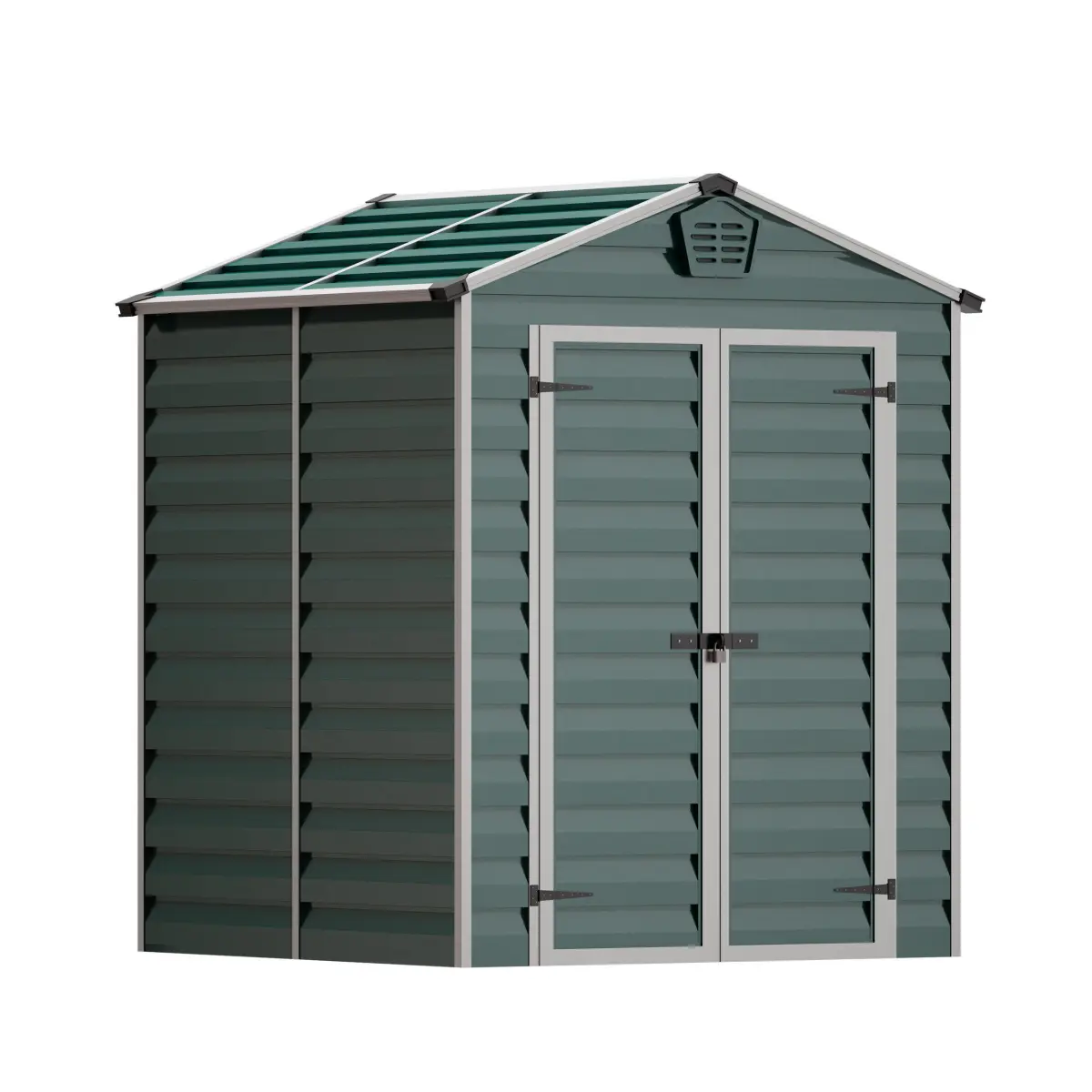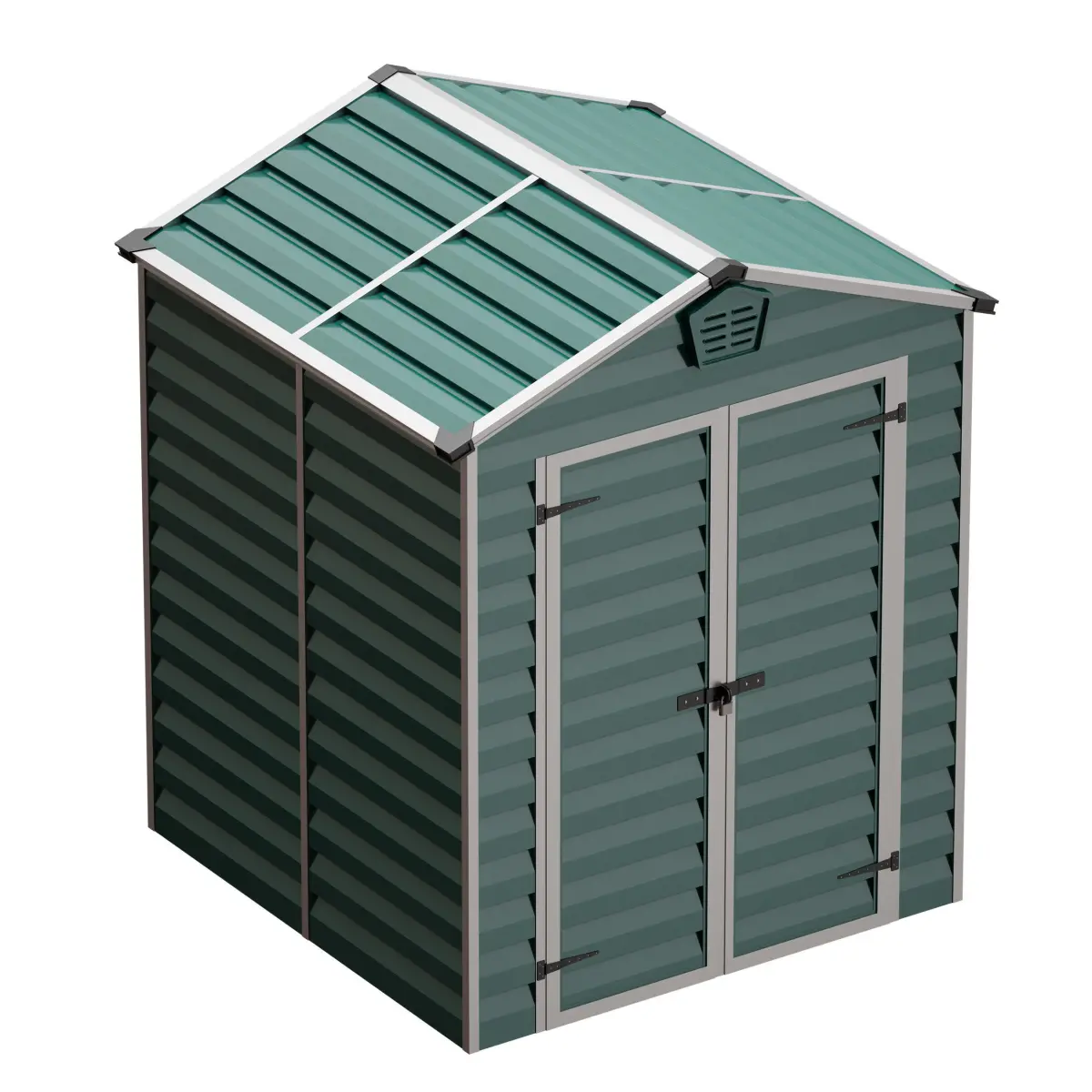 3D model of a small yard building (house, shed, shed, hangar, bunker, booth, cabin, cabin, storage space). Made of metal, green siding, framed with aluminum profile, with double doors on awnings with a lock and ventilation grilles. Can be used as a yard building, as a boat house or as an element of the urban environment.
