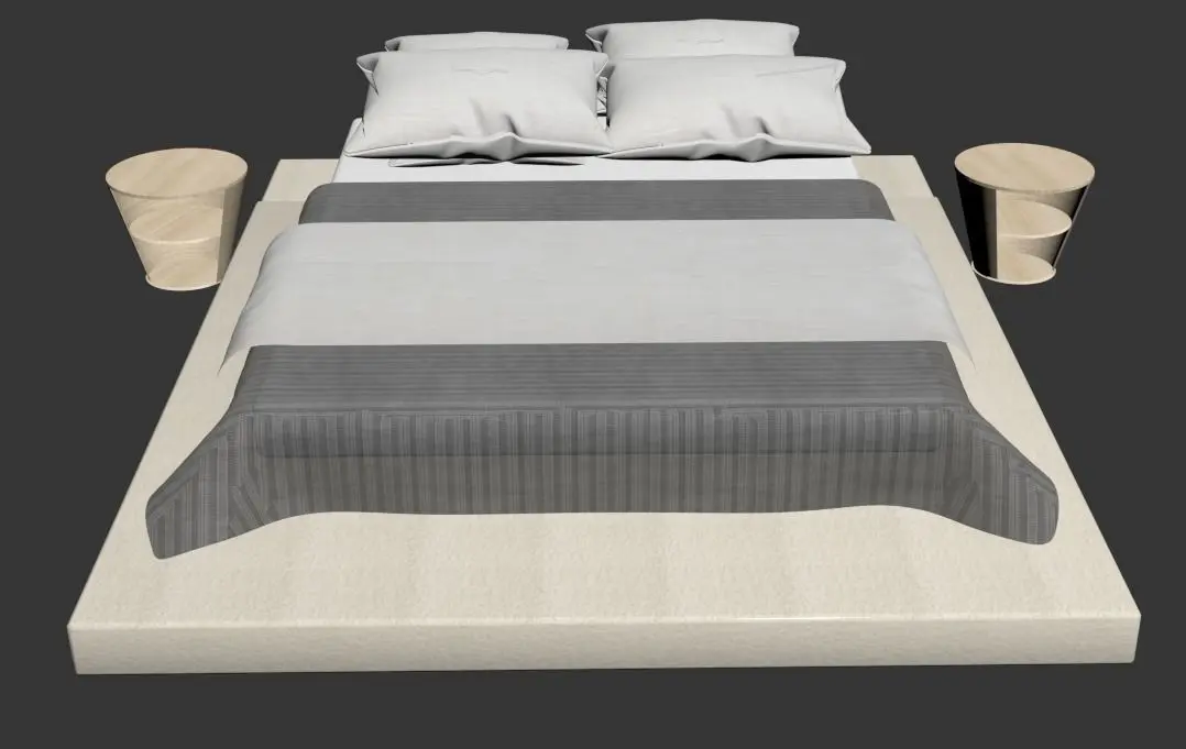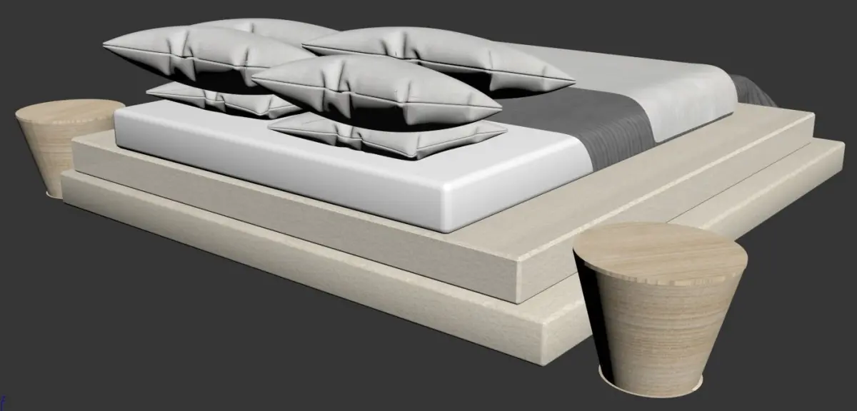2 basamak üzerine oturtulmuş yatak ve 2 kat yatak örtüsü tasarımıyla birlikte tamamlayıcı komodin ögeleriyle tasarlanmış modern bir yatak ekstra olarak 4 adet yastık da mevcuttur. malzemelerin hepsi dosyada bulunmaktadır.