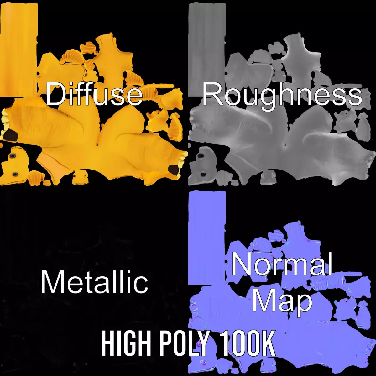 The model's textures are PBR, Diffuse, NormalMap, and reflection/roughness/metallic, which are suitable for any modern rendering engine. All models are accurately unwrapped and have no overlapping UV. All textures are 4096*4096 in size.