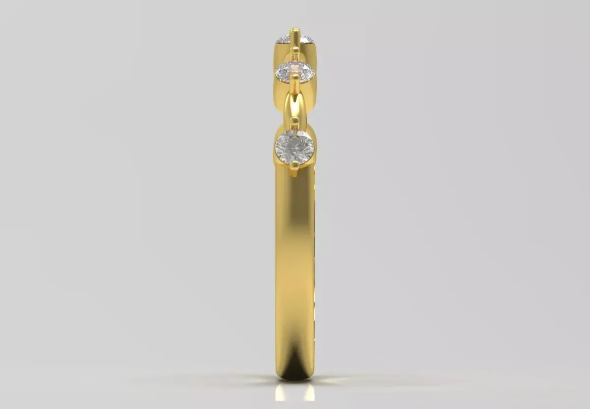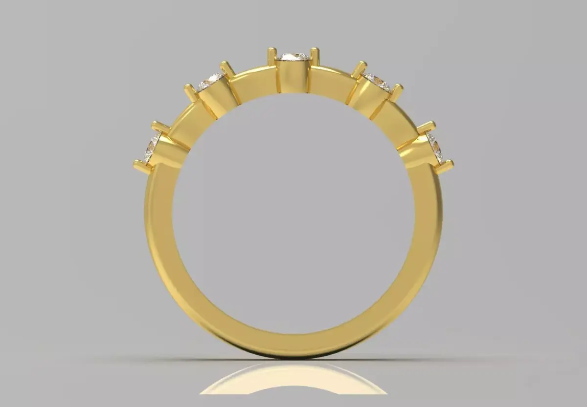 - * Five brilliant round brilliant-cut diamonds are spaced on the ring.