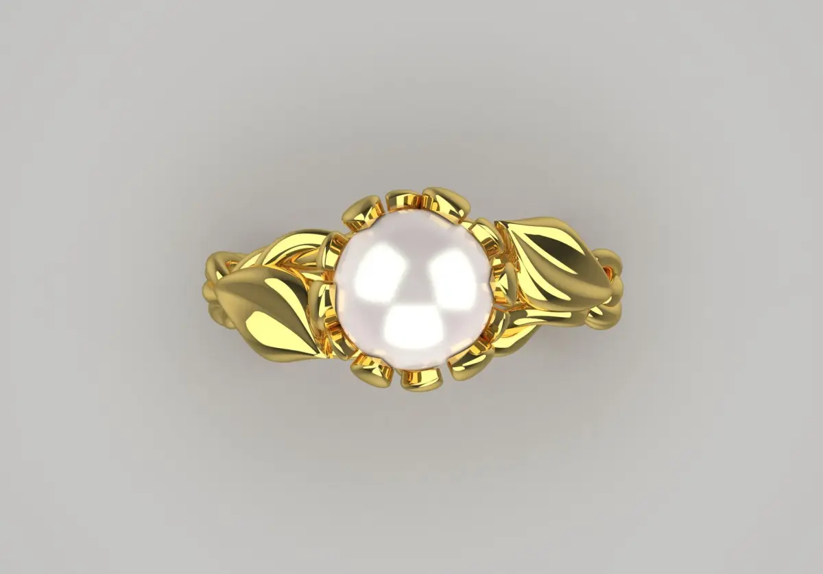 At the center, a large, lustrous pearl is beautifully set to resemble a flower blossom. The pearl is crowned with a petal-like shape that enhances its beauty. The band itself features a twisted design that gives it unique texture and depth, while leaf motifs beautifully wrap around the sides, symbolizing growth and elegance. The polished gold finish lends the ring a radiant sheen, making this ring a perfect piece for formal occasions or a luxurious everyday accessory. The combination of organic forms and rich materials creates a captivating and timeless aesthetic.
