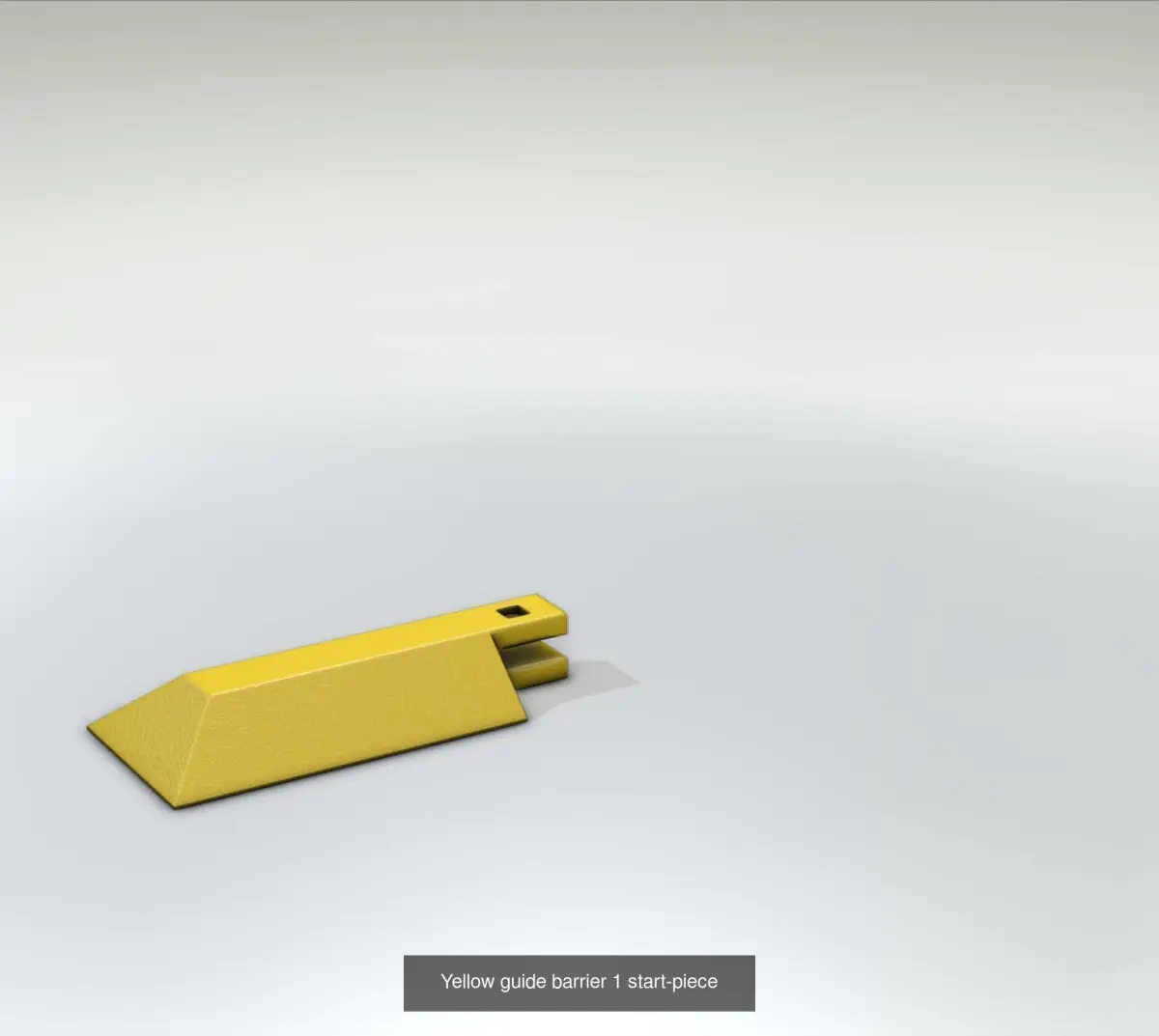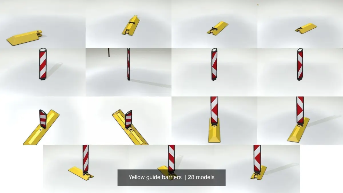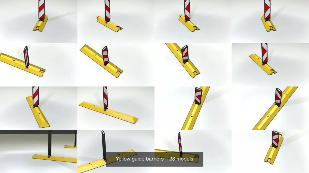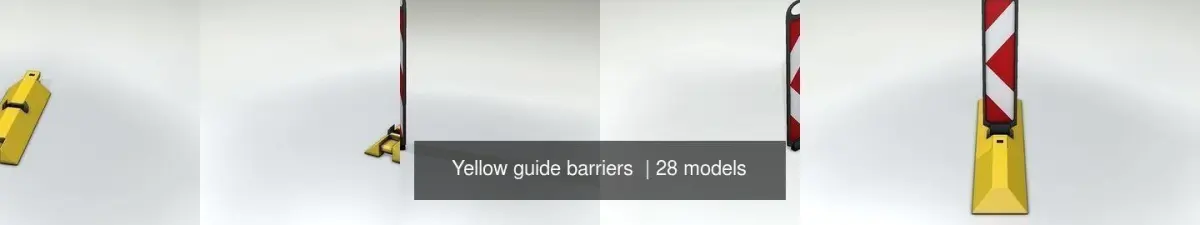 Eine Sammlung von 28 gelben Leitschwellen für Straßen und Autobahnen.