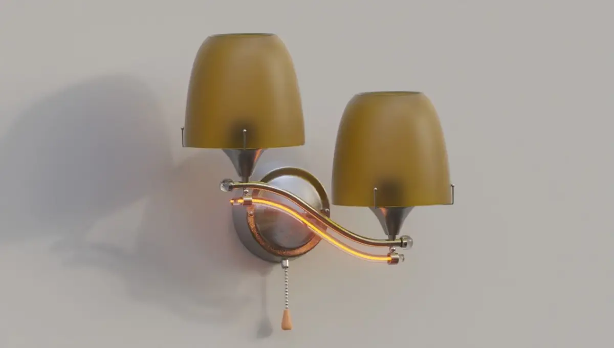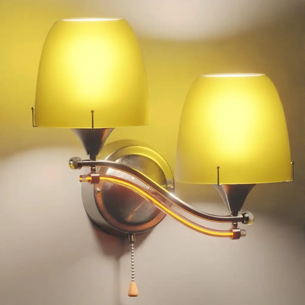 A metallic lamp that we are using it for a bedroom with glassy and metallic design with a chain switch for tuning it on or off. and a little shiny line in a glass cylinder that make it much better!!!