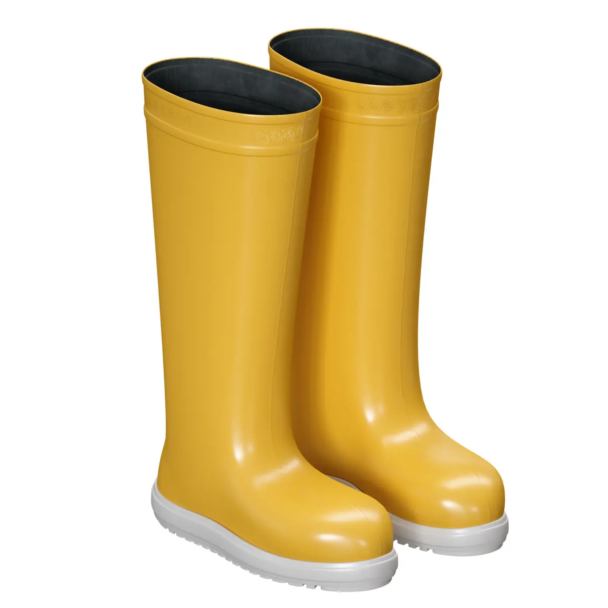 3D model of rubber boots. The base is yellow rubber, on a white rubber sole with a tread, the inside is made of a dark rubberized lining, and a fabric insole. The model has several options for boots: in normal condition, two options with rolled edges, two options for a curved boot.