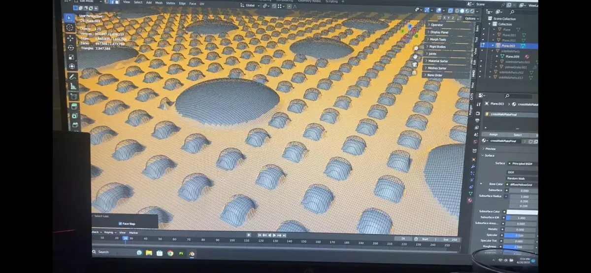 Sidewalk truncated dome bump pads. Baked from 5 million vertices to 4 vertices, this sidewalk truncated dome map is a perfect solution to low or high poly games. Created in Blender, painted in substance painter.