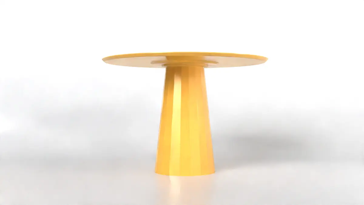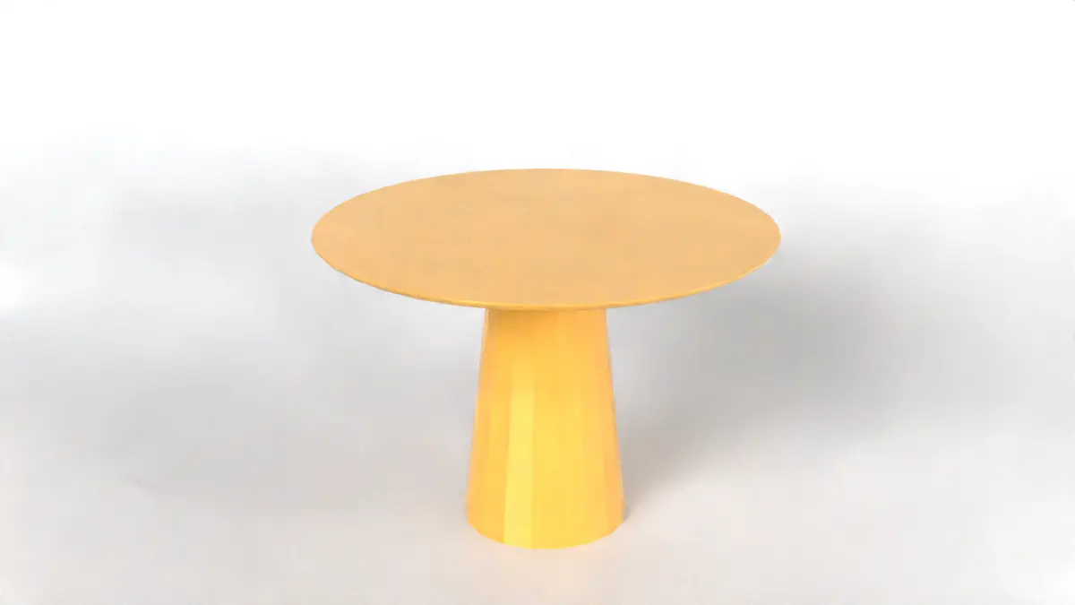 This 3D model represents a sleek and modern table with a minimalistic design. The table features a circular top supported by a faceted, tapered base, emphasizing a contemporary aesthetic. The bright yellow finish adds a vibrant touch, making it ideal for modern interiors or stylish architectural renderings.Technical Features