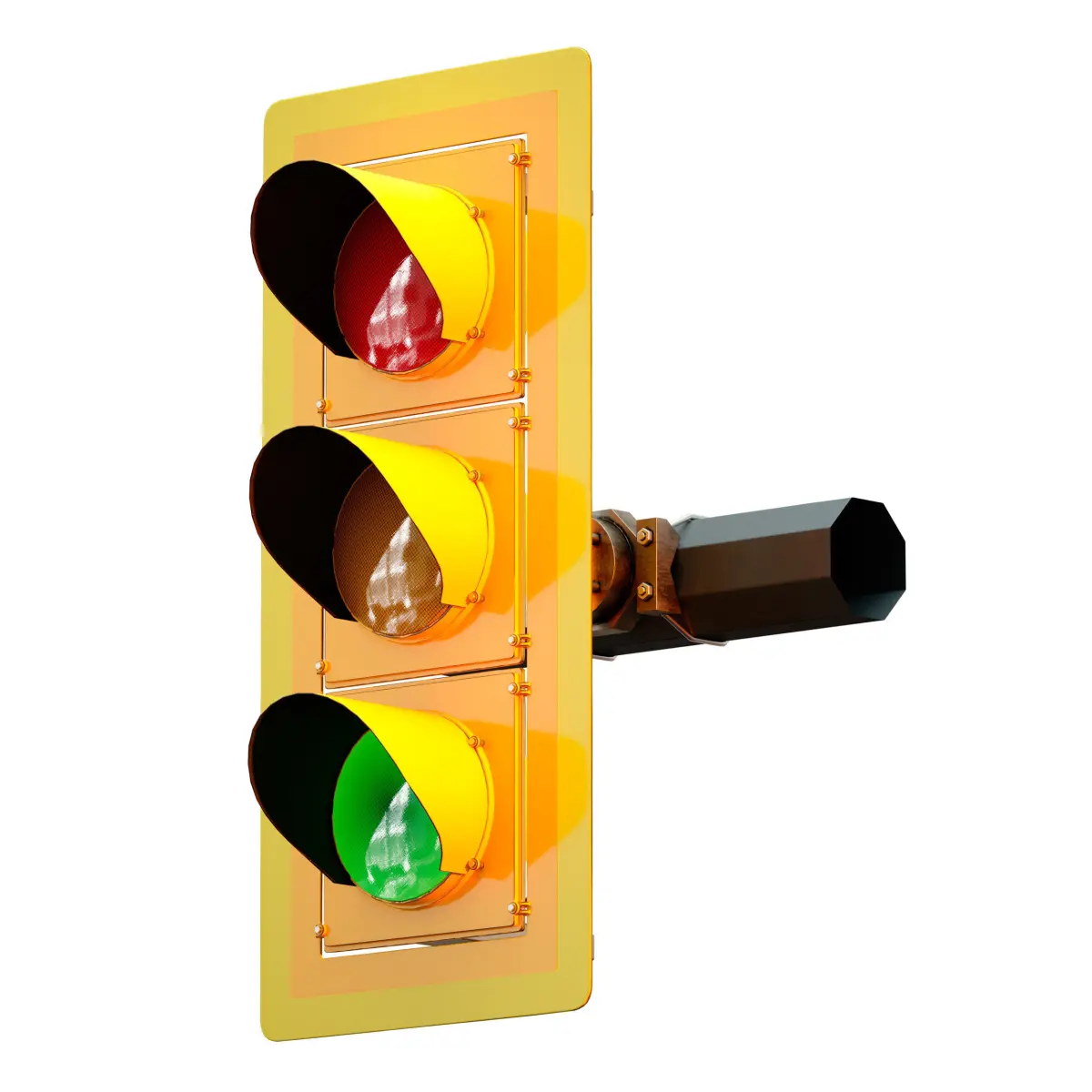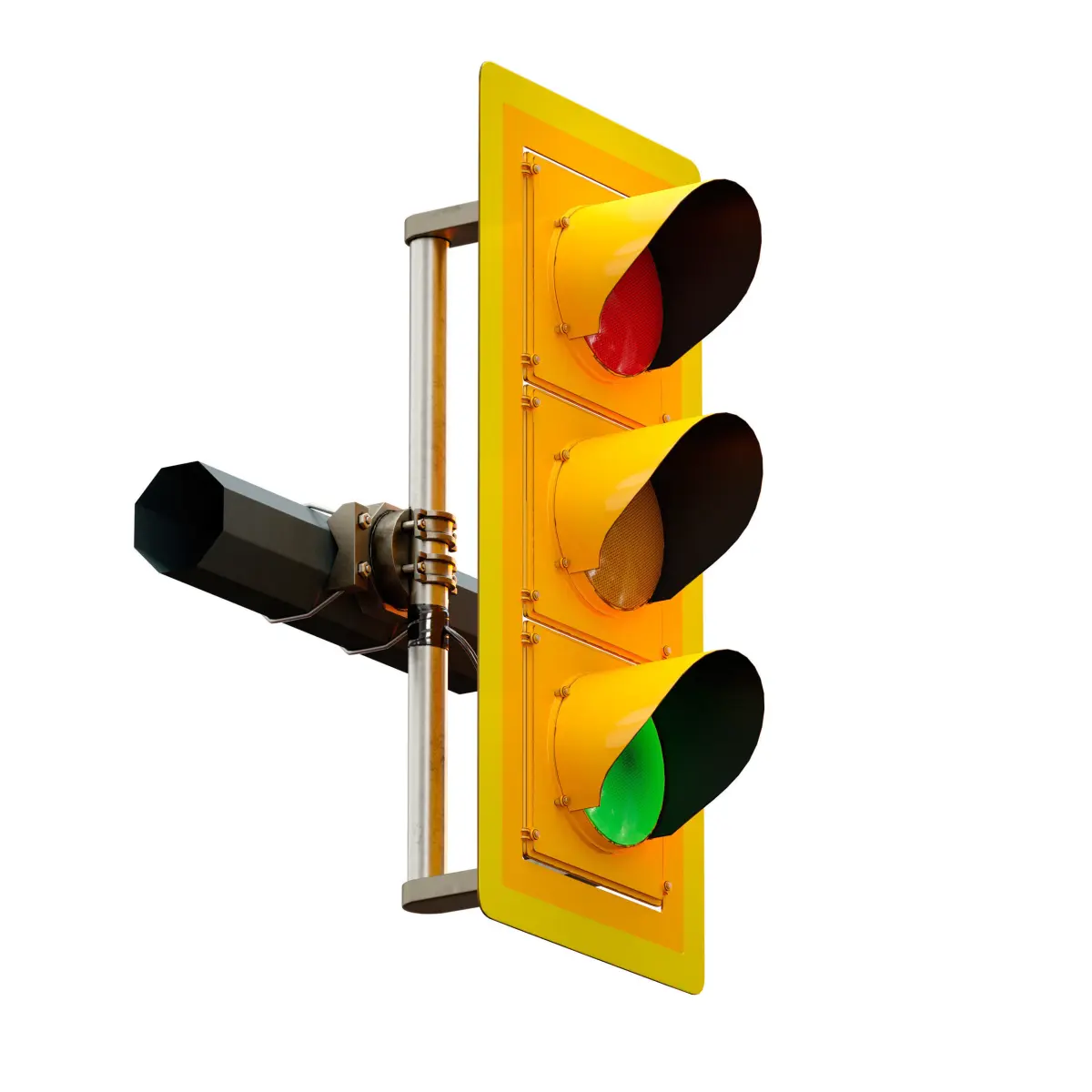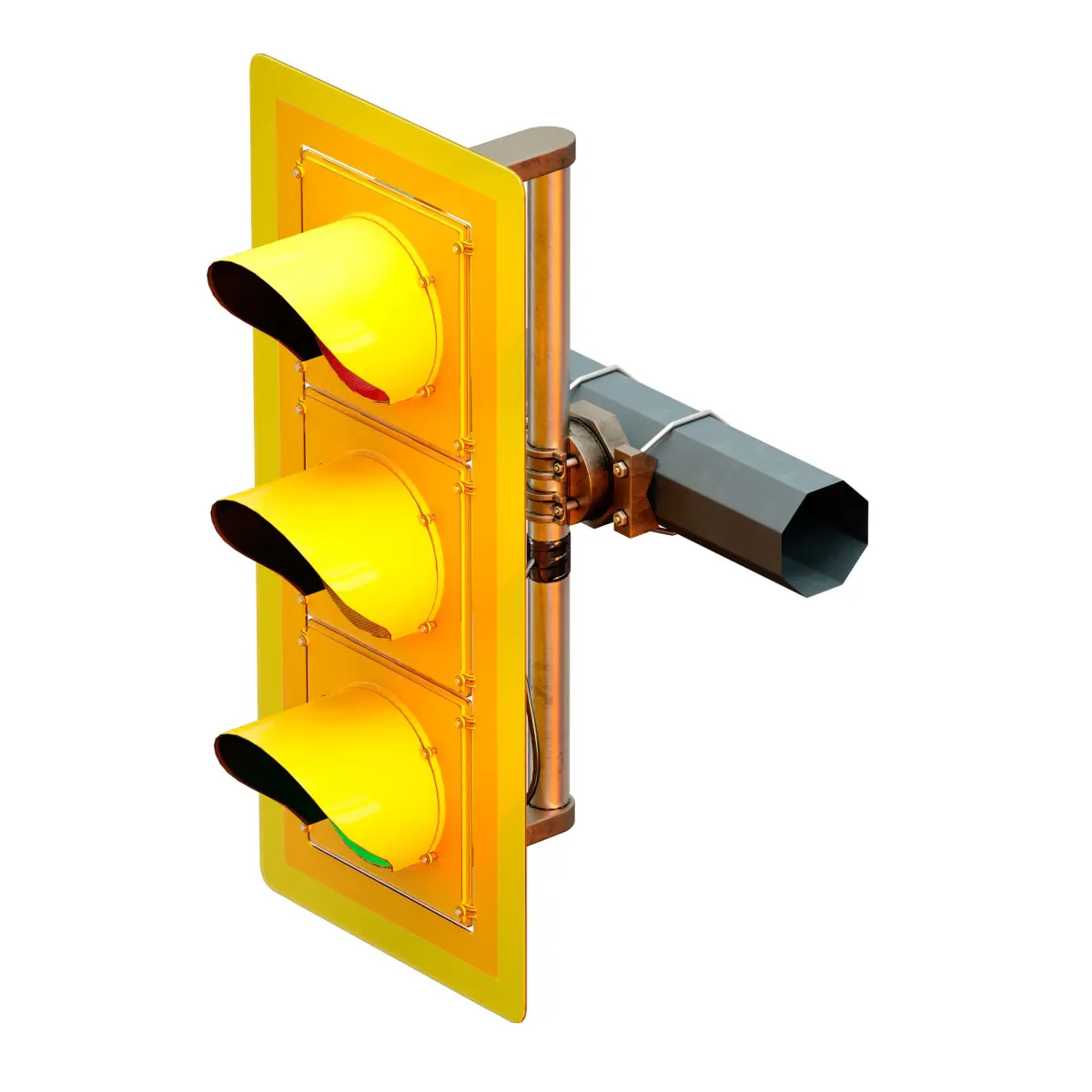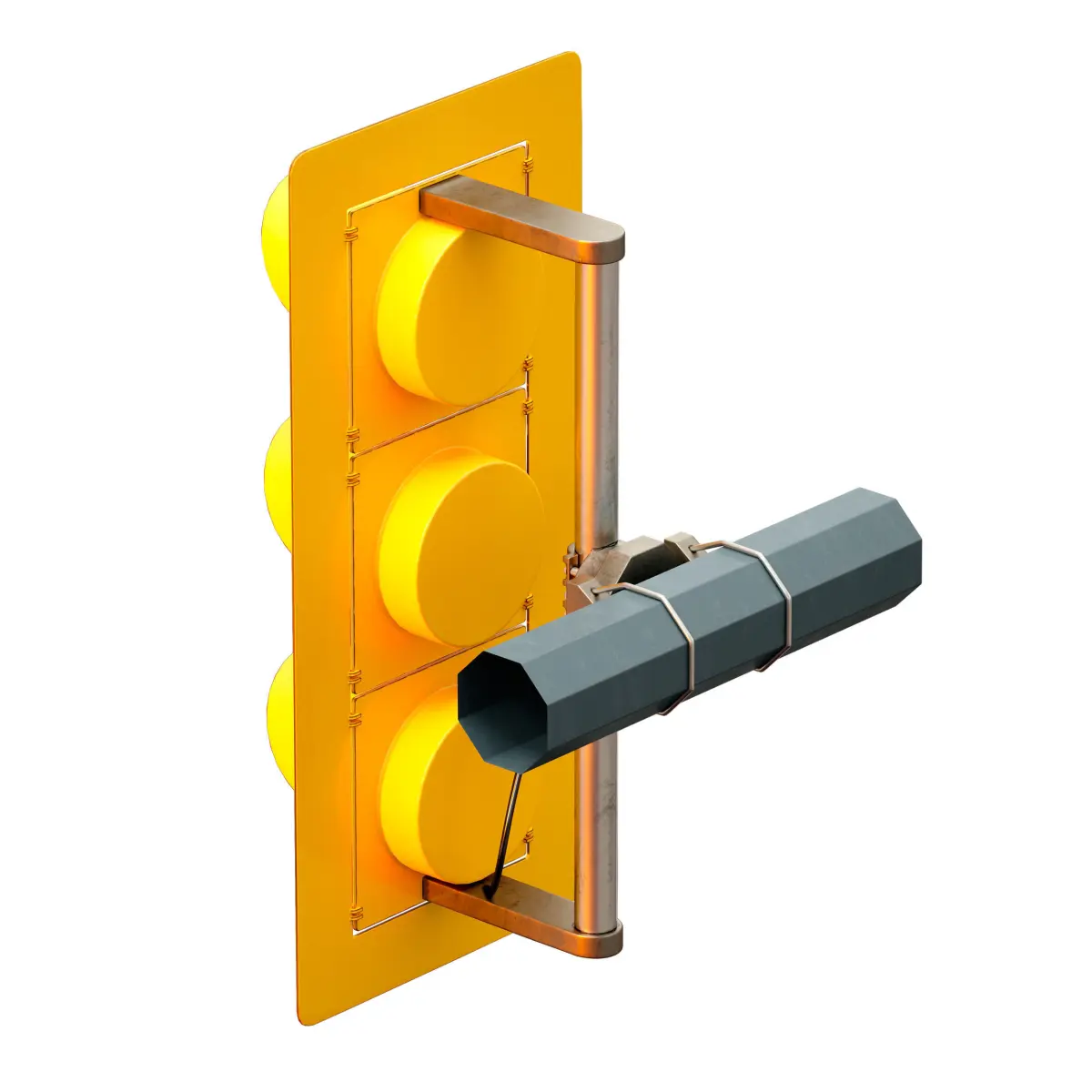 3d model of a suspended traffic light, yellow and orange, made of metal. The traffic light is attached to the poles using a special mount on clamps, it can be installed on a vertical or horizontal pole. There is also a horizontal traffic light option. Separately, there are red, green and yellow lights with the signal turned on. You can set the desired traffic signal by replacing the desired lamp. The model is made for anti-aliasing and can be smoothed with the TurboSmoth modifier for large angles.