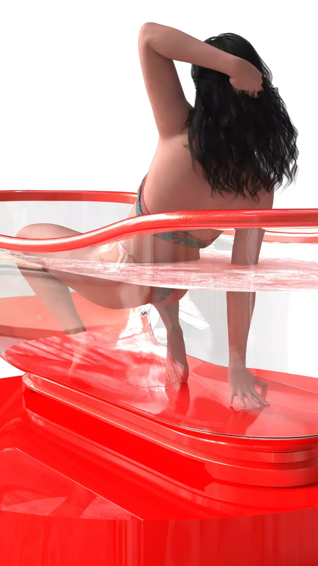 Yennefer is wearing an exotic, colorful patterned bikini (a departure from her usual black and white palette), maintaining her characteristic dark hair and a serene, confident expression. The render focuses on contrast: the fantasy world sorceress immersed in an environment of bold, modern luxury. The deep red color of the tub and floor creates a dramatic reflection, accentuating the atmosphere of glamour and power.
