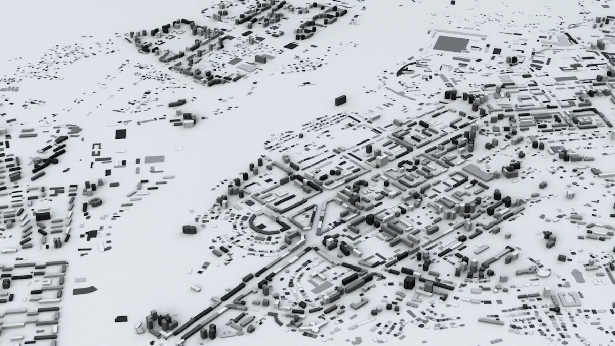 - the model is positioned on a flat surface (all buildings are on the “floor” - no elevation data included)