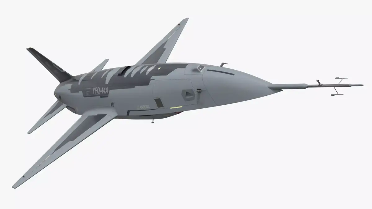 This model is designed with sharp stealth-optimized contours and detailed surface geometry featuring multiple missile bays and antenna arrays. The gunmetal grey finish enhances its realism, while paneling, vents, sensors, and hardpoints are intricately rendered to reflect modern combat aircraft. The model includes decals and ID markings such as "YFQ-44A", adding authenticity for use in professional simulations and cinematic visualizations.