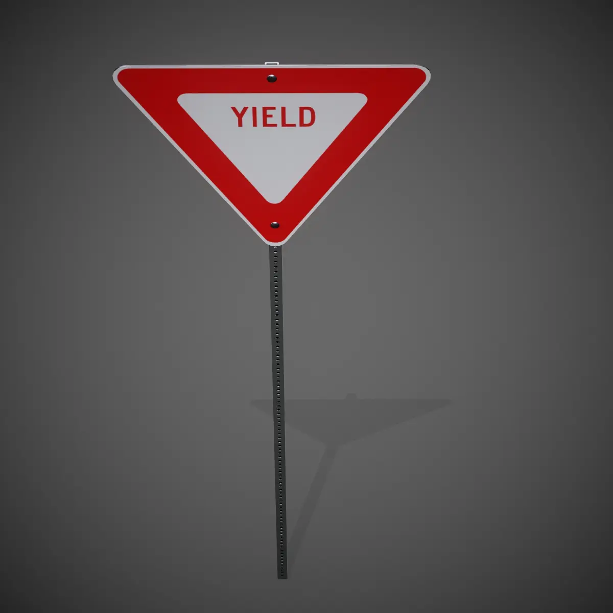 This is a realistic 3D model of a standard traffic YIELD sign with post and mounting fasteners.
