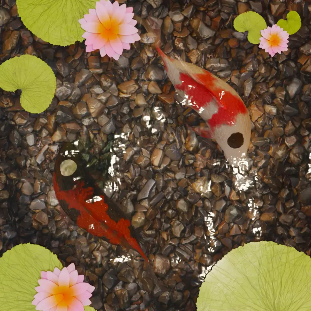 Calming 3D scene of a Yin Yang Koi pond.This scene includes a rigged, UV unwrapped and textured low poly fish model (intentionally no good topology). A cloth simulation for its fins, shaders for every object, a high-resolution PBR stone texture and a dynamic paint simulation for the Water.Everything in this scene can and may be changed according to your wishes. Everything from this project may also be used in your own projects.