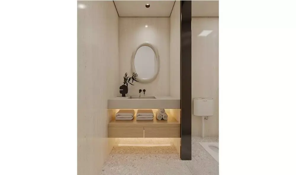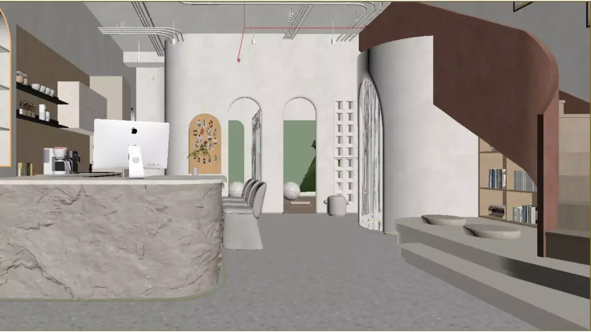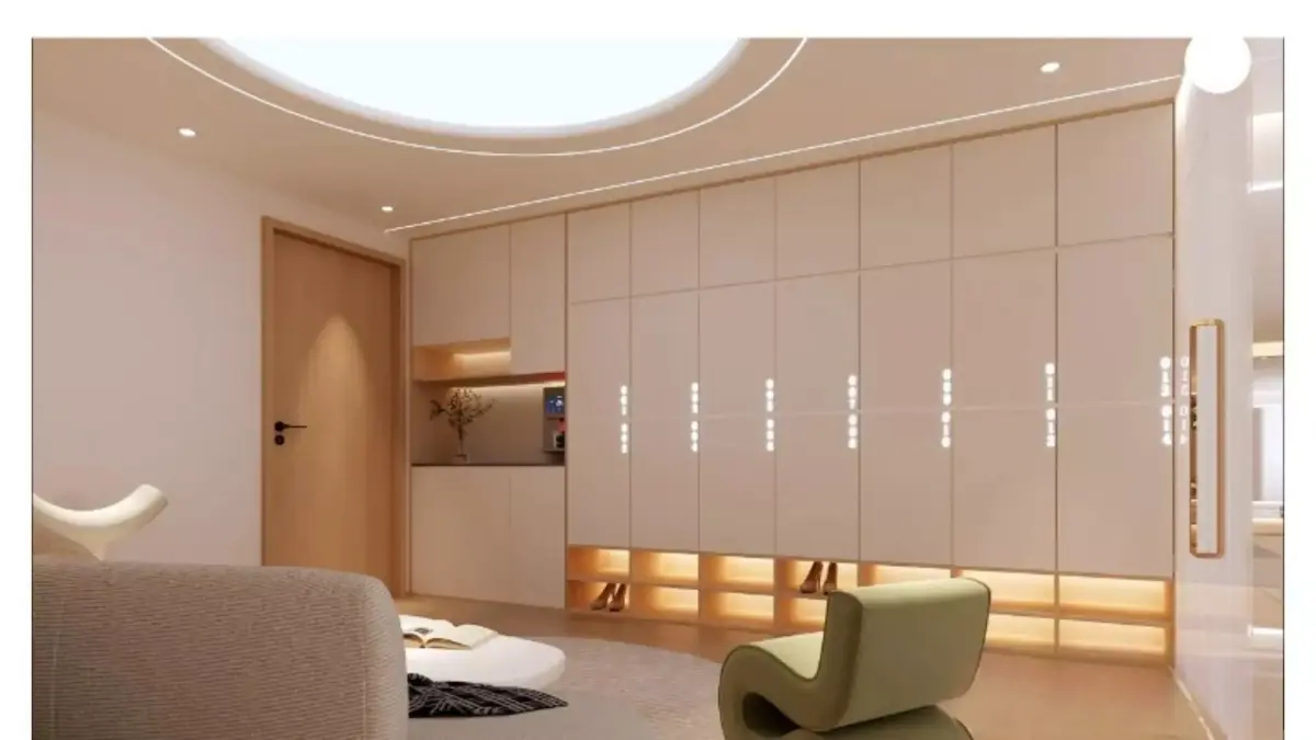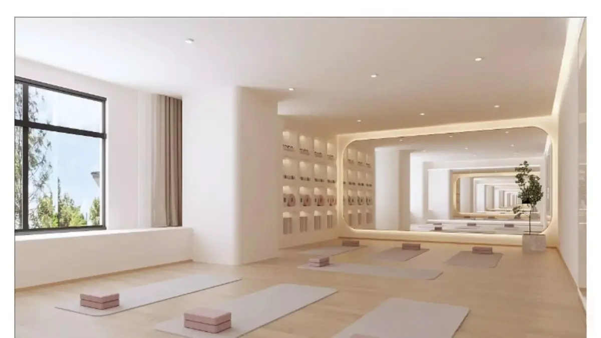 Intelligent storage cabinets and rest areasCore function: As a storage and transitional space for the venue, the entire wall is a light beige intelligent storage cabinet, with digital touch light effects on the cabinet door, and a shoe compartment with warm light strips at the bottom, serving both storage and display functions.Atmosphere creation: The ceiling adopts a circular soft light ceiling and linear light strips, paired with light wood doors and soft furniture (light gray sofa, olive green shaped chair, white round table), creating a warm and luxurious resting atmosphere.Detail highlight: The open small bar next to the storage cabinet is filled with dried flowers and small appliances, making the space more lively.Professional Pilates/Yoga ClassroomCore function: As the core training area, the space is spacious and bright, with light gray yoga mats neatly laid on the light wood floor, matched with pink yoga bricks, suitable for group courses.Atmosphere building: large french window introduce natural light, light beige walls and embedded shelves (for yoga accessories), together with a large curved mirror, not only expand the sense of space, but also facilitate students to observe movements.Detail highlights: The soft no main light design and green plant embellishments make the entire space full of a peaceful and healing sports atmosphere.Entrance and leisure areaCore function: As the entrance and social space of the venue, the terrazzo floor is paired with warm white walls, and the well-designed curved staircase is the visual focus.Atmosphere creation: The open bookshelves and cushions below the stairs create a comfortable reading corner; The arched door on the left side and the dressing area combine aesthetics and practicality; Large french window introduce the street view into the interior, making the space more transparent.Detail highlights: The exposed pipeline lines and artistic hanging paintings add a modern artistic sense, suitable for students to communicate and relax before and after class.