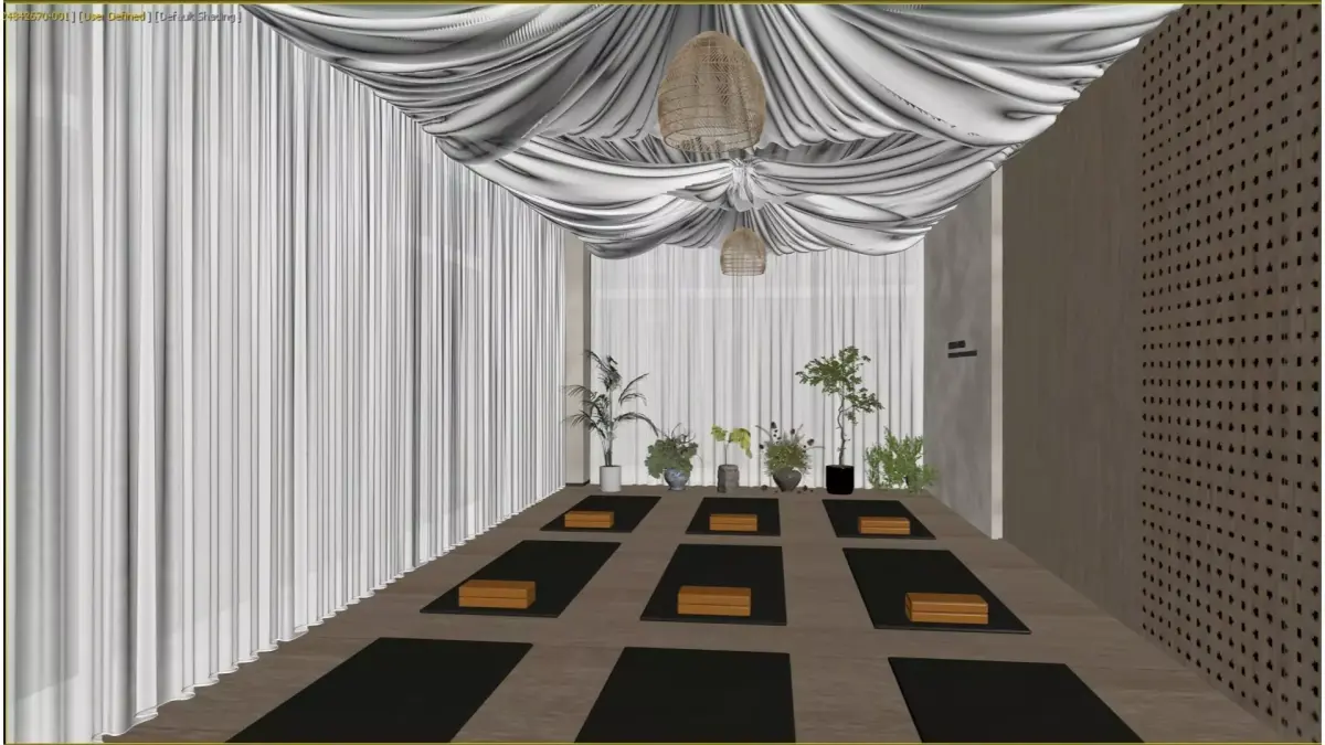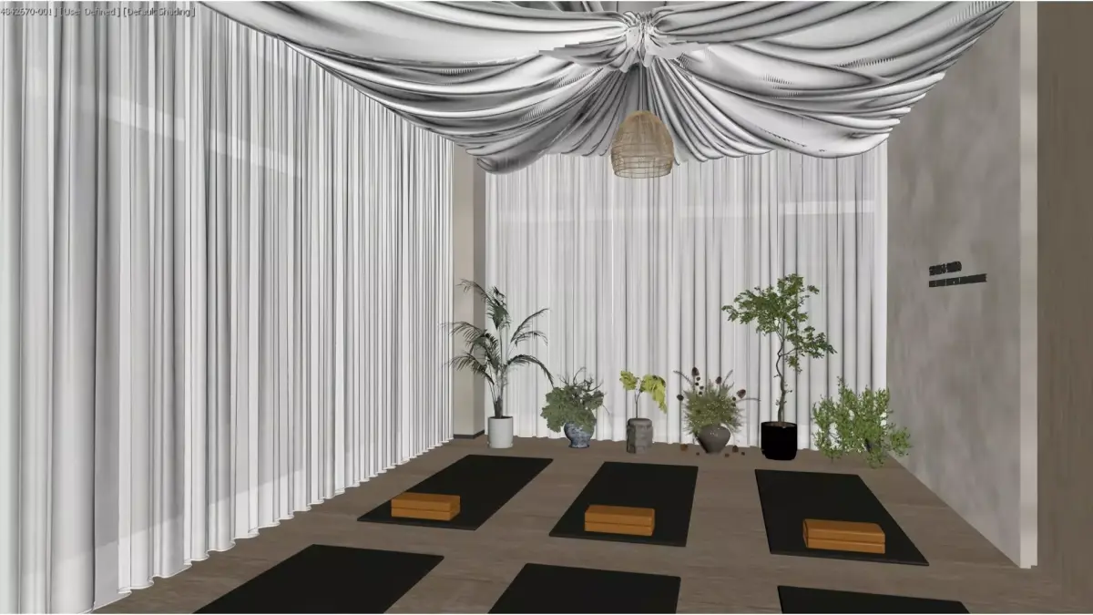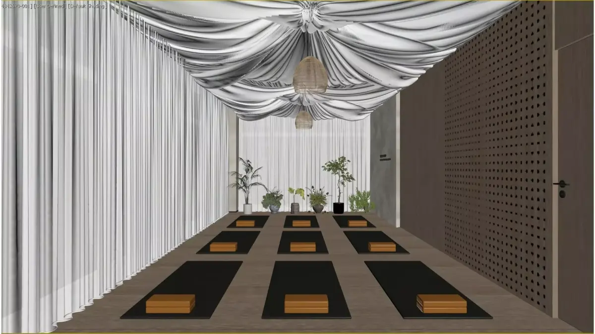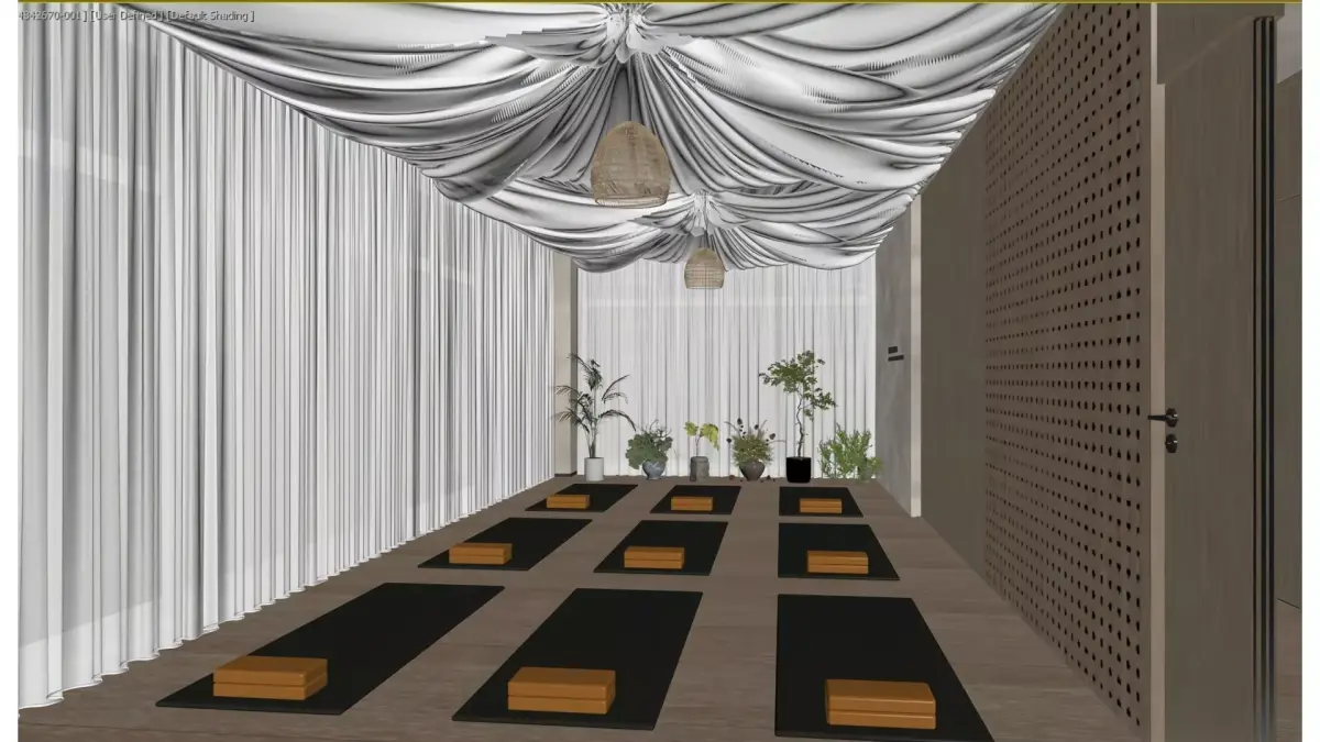 This is a professional yoga studio dominated by the primary hues of natural wood and pure white, boasting an open and bright space.Large areas of semi-transparent white gauze curtains let in soft natural light. Combined with the layered suspended fabric ceiling and woven chandeliers overhead, they create a relaxing sense of enclosure as well as a ceremonial ambiance.The walls are adorned with perforated wooden panels that are both aesthetically pleasing and acoustically effective. Neatly arranged yoga mats and wooden yoga blocks on the floor provide practitioners with a professional and tranquil venue for physical and mental healing.The overall design integrates natural elements with minimalist aesthetics, creating a functional and atmospheric space for meditation and exercise.