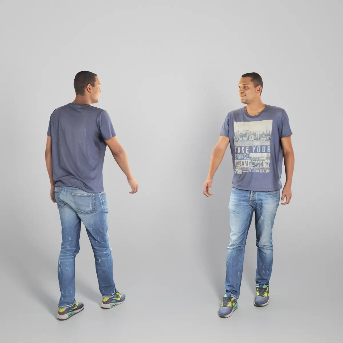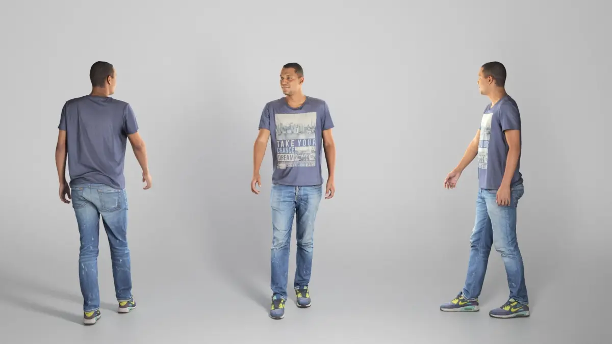 This is a true human size and detailed model of a sporty handsome young man of African appearance. The model is captured in casual pose to be perfectly matching for various architectural, product visualization as a background character within urban installations, city designs, outdoor design presentations, VR/AR content etc.