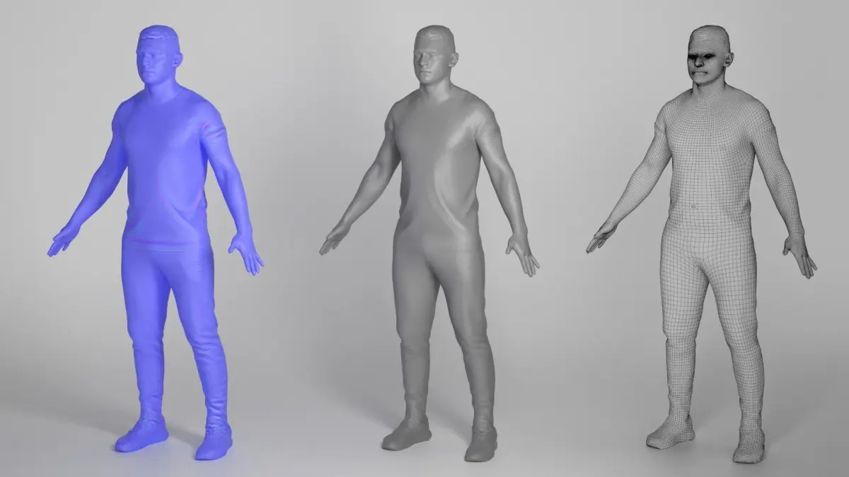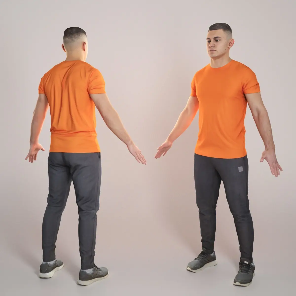 This is a true human size and detailed model of a young handsome man of Caucasian appearance dressed in sportswear. The model is captured in the A-pose with mesh ready for rigging and animation in all most usable 3d software.