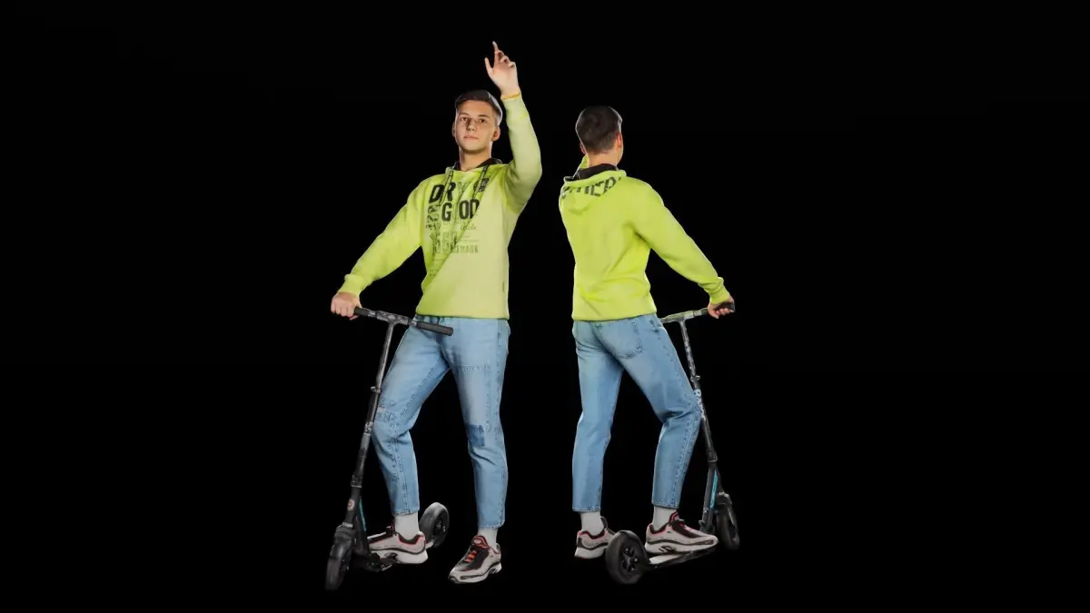 This is a true human size and detailed model of a sporty handsome young man of Caucasian appearance dressed in casual style riding on a skooter. The model is captured in casual pose to be perfectly matching for variety of architectural visualizations, e.g. urban installations, city designs, outdoor design presentations etc.