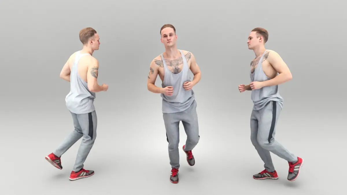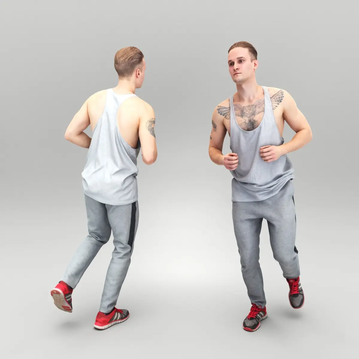 This is a true human size and detailed model of a sporty handsome young man of Caucasian appearance dressed in a sportswear. The model is captured in a casual pose to be perfectly matching to various architectural and product visualizations as a background, mid-sized or close-up character on a sport ground, gym, jogging track, park, VR/AR content, etc.