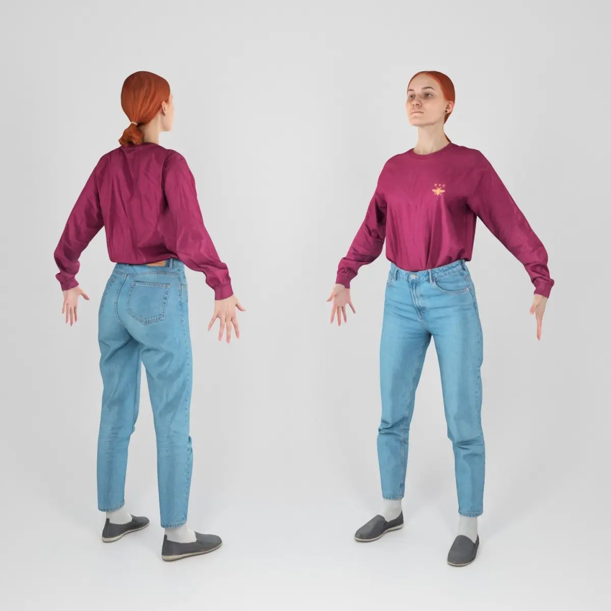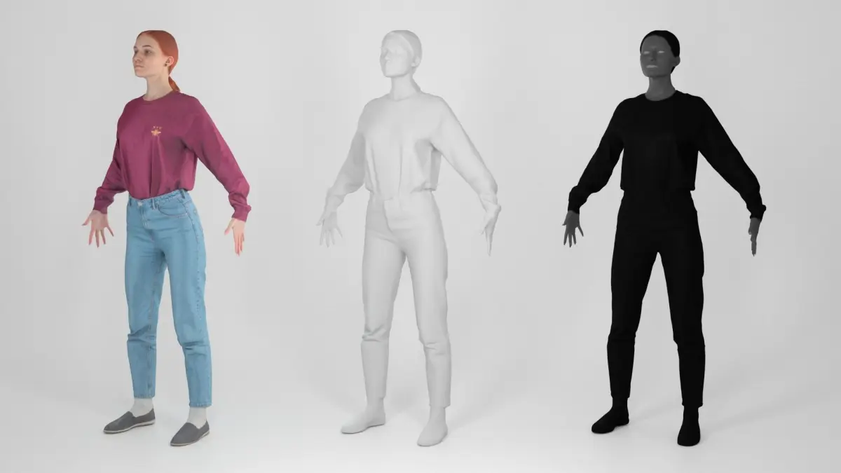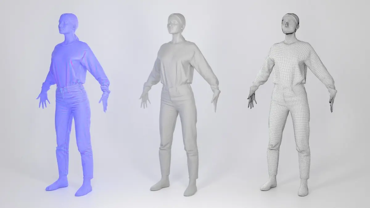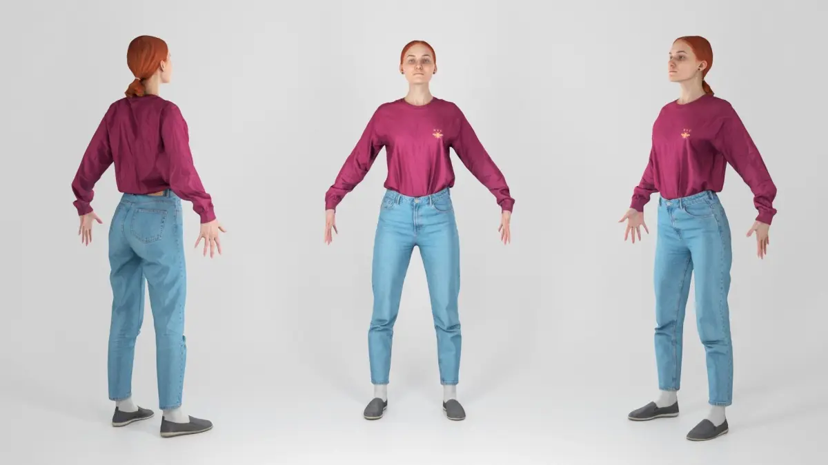 This is a true human size detailed model of a young beautiful woman of Caucasian appearance dressed in casual style. The model is captured in the A-pose with mesh ready for rigging and animation in all most usable 3d software.