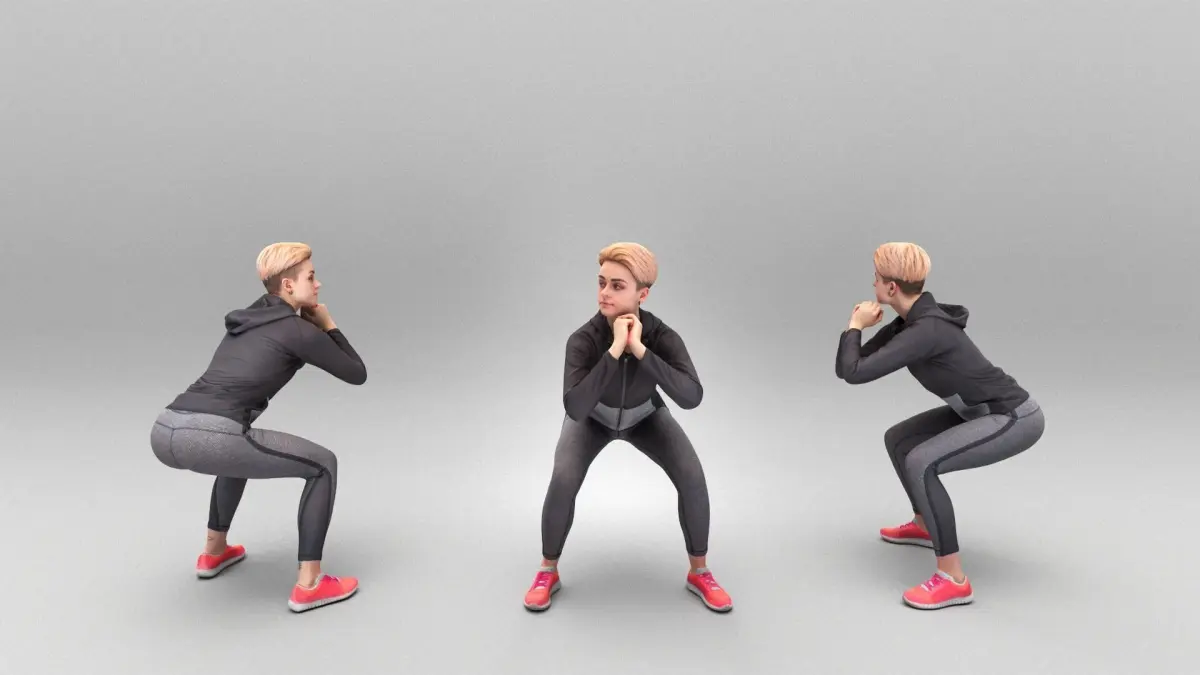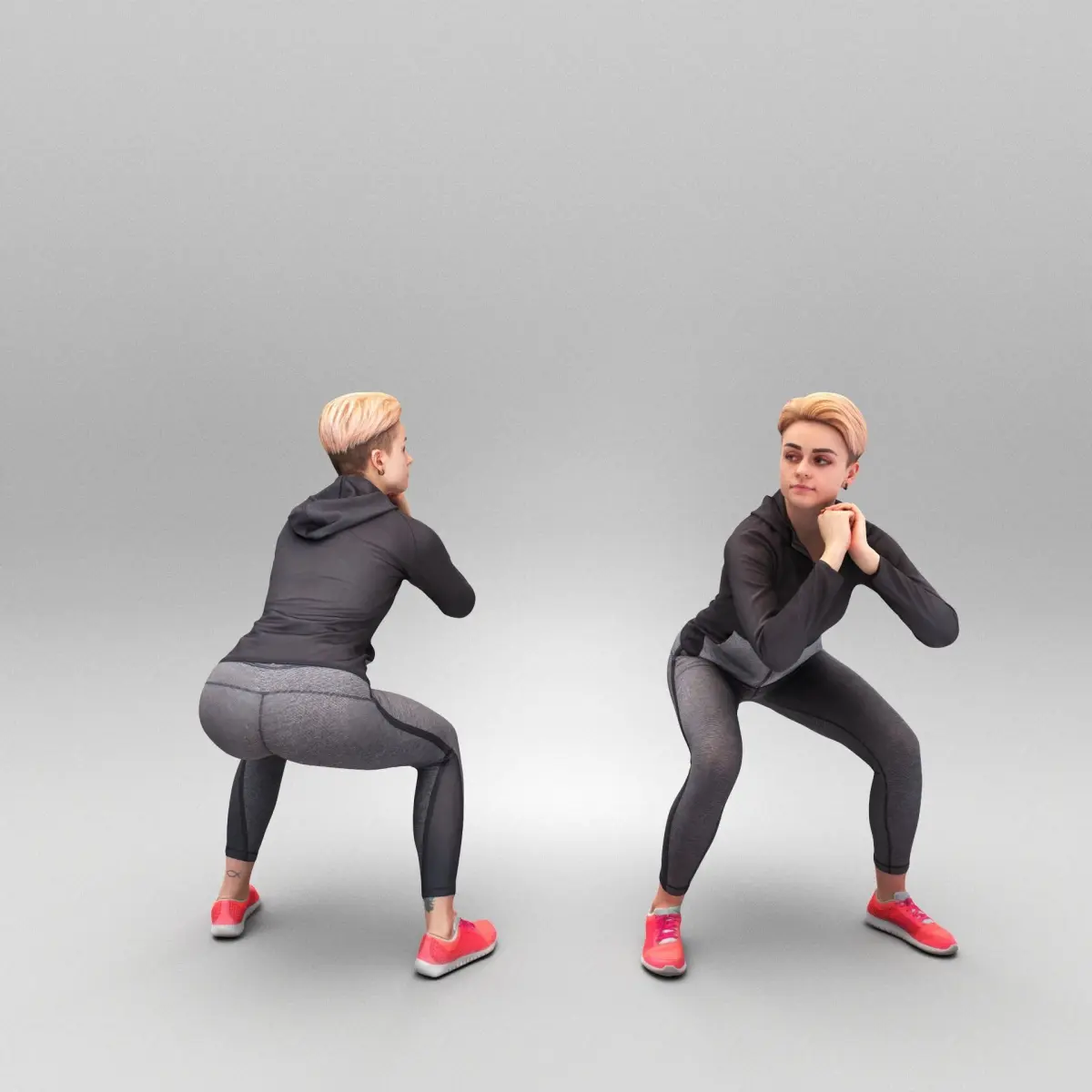 This is a true human size and detailed model of a sporty beautiful woman of Caucasian appearance dressed in sportswear. The model is captured in casual pose to be perfectly matching various architectural and product visualizations, as a background or mid-sized character on a sports ground, gym, beach, park, VR/AR content, etc.