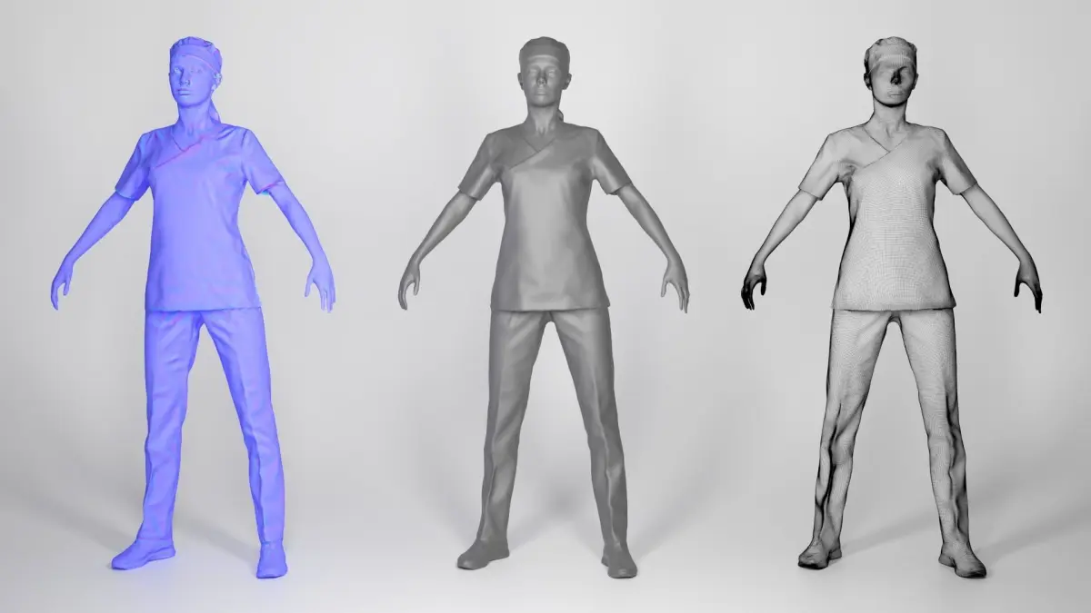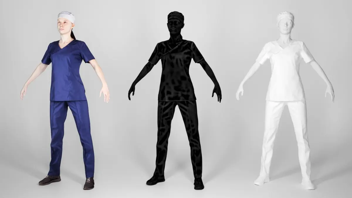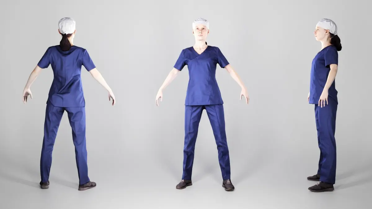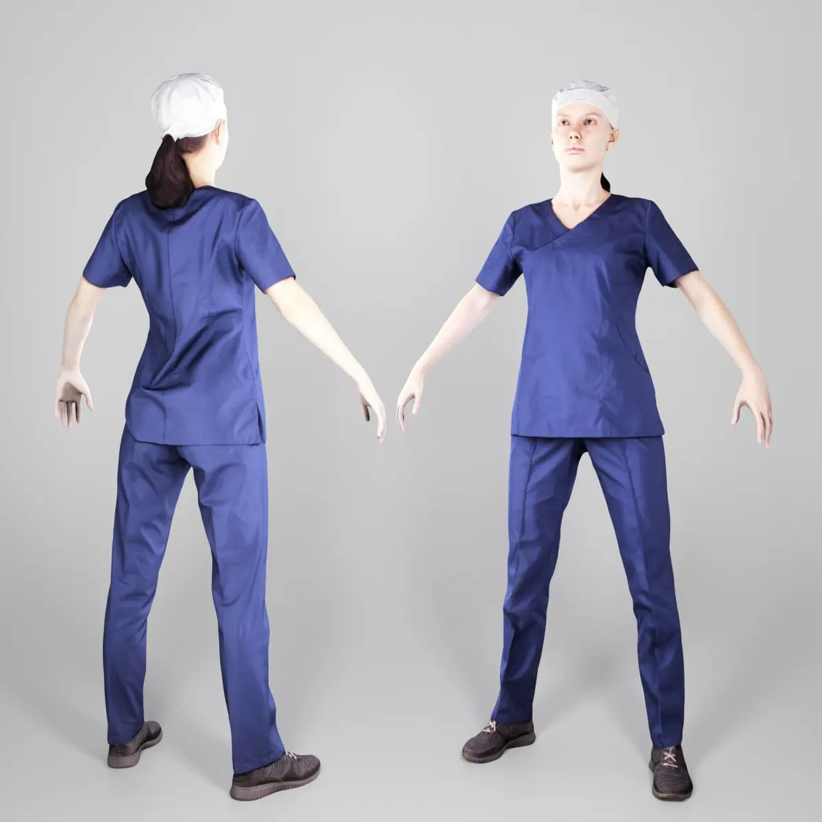This is a true human size and detailed model of a beautiful young woman of Caucasian appearance dressed in surgical uniform. The model is captured in the A-pose with mesh ready for rigging and animation in all most usable 3d software.