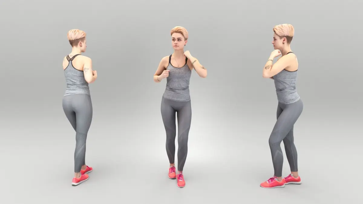 This is a true human-sized and detailed model of a sporty beautiful woman of Caucasian appearance dressed in sportswear. The model is captured in a casual pose to perfectly match various architectural and product visualizations, as a background or mid-sized character on a sports ground, gym, beach, park, VR/AR content, etc.
