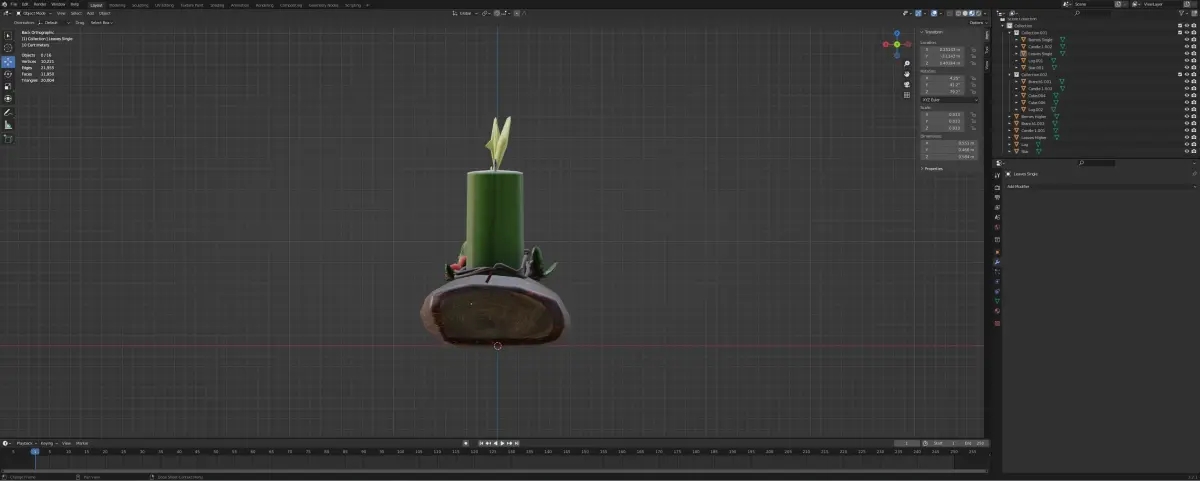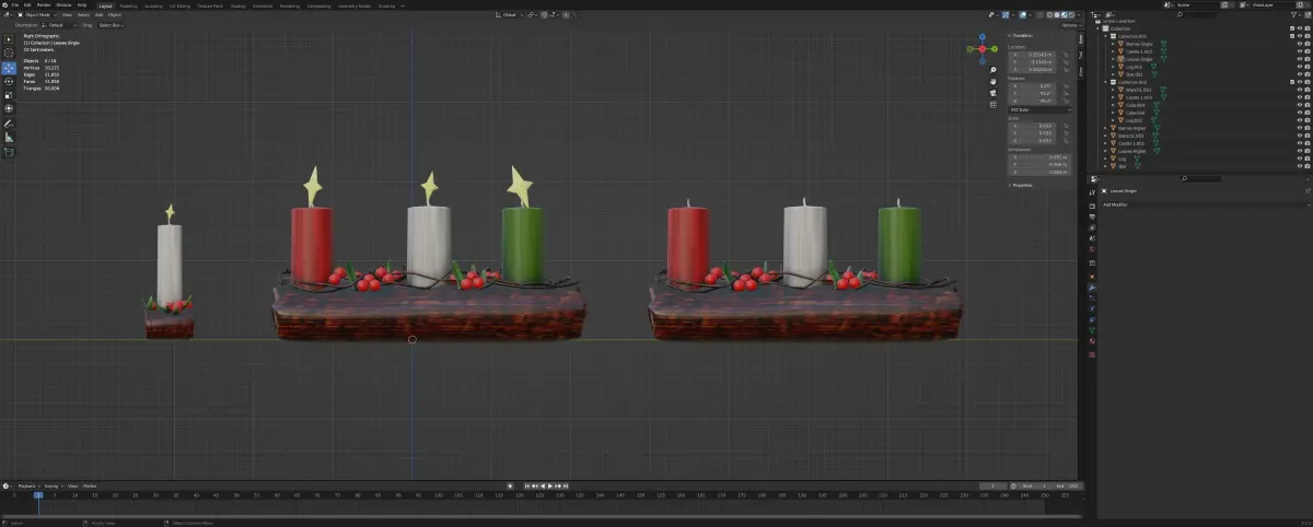 In the Blender file, the pieces are not linked, providing better ability to customize these candles. Additionally, there are DAE and OBJ files ready to load. The items in the Blender file include a higher vertices and a lower vertices version of the three candles.