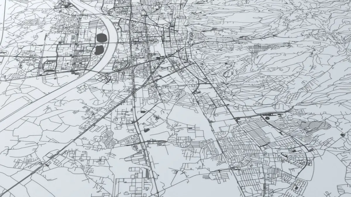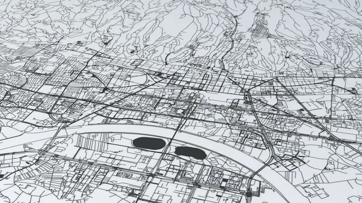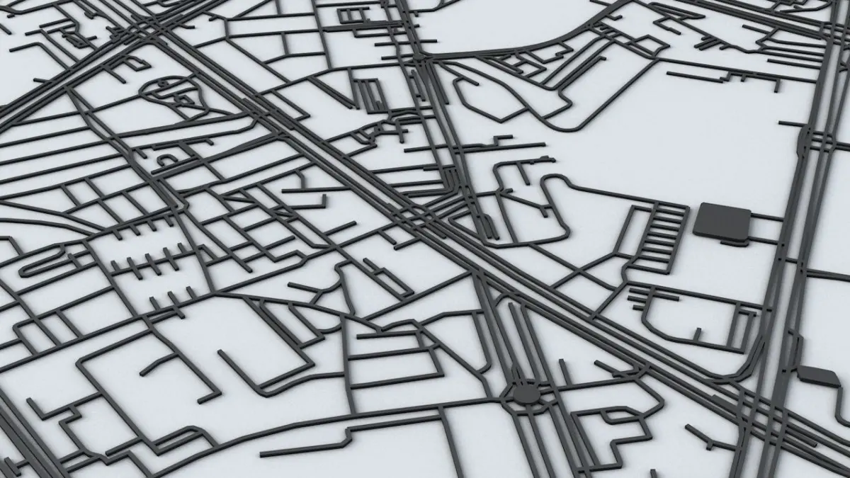 - the model is positioned on a flat surface (road network is on the “floor” - no elevation data included)
