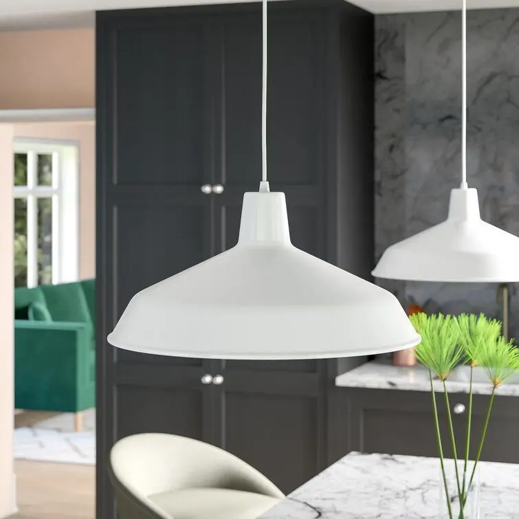 - An ideal option for illuminating the dining table or kitchen island, this bowl pendant combines form and function for a modern look. Its wide bowl-shaped shade directs light downward, assisting you whether you’re prepping for dinner or taking off your shoes in the entryway. Crafted from metal, this design includes a ceiling plate and a hanging cord measuring 120''. The fixture measures 7'' H x 16.5'' W x 16.5'' D overall.