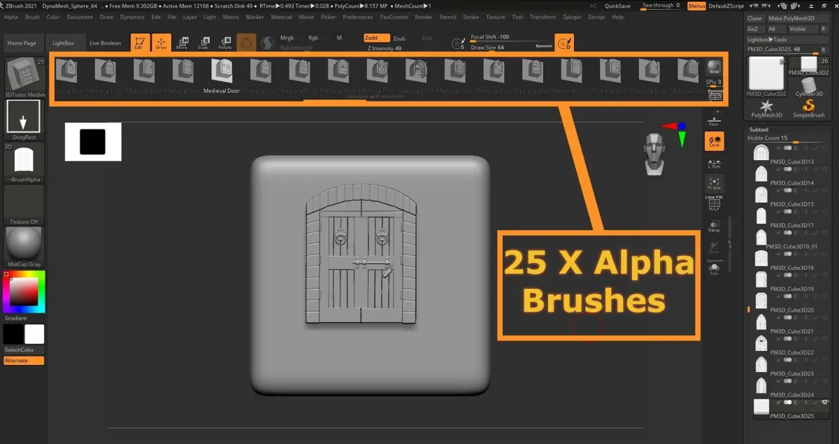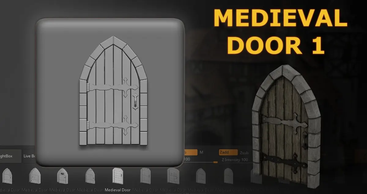 This is the Zbrush Medieval Imm & Alpha Brush set. 50 brushes in total plus 25 photoshop displacement maps ready for importing into other software.