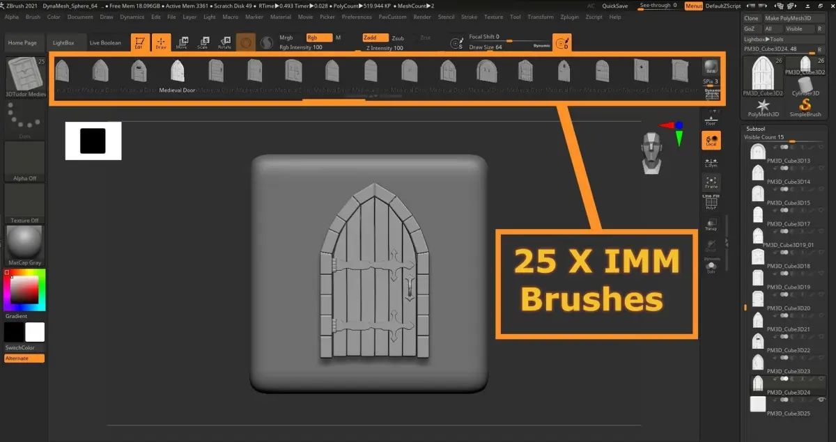 The brushes are imported as multi brushes allowing for ease of use between doors. Each door was created to a high modeling level and can easily be subdivided and details added.