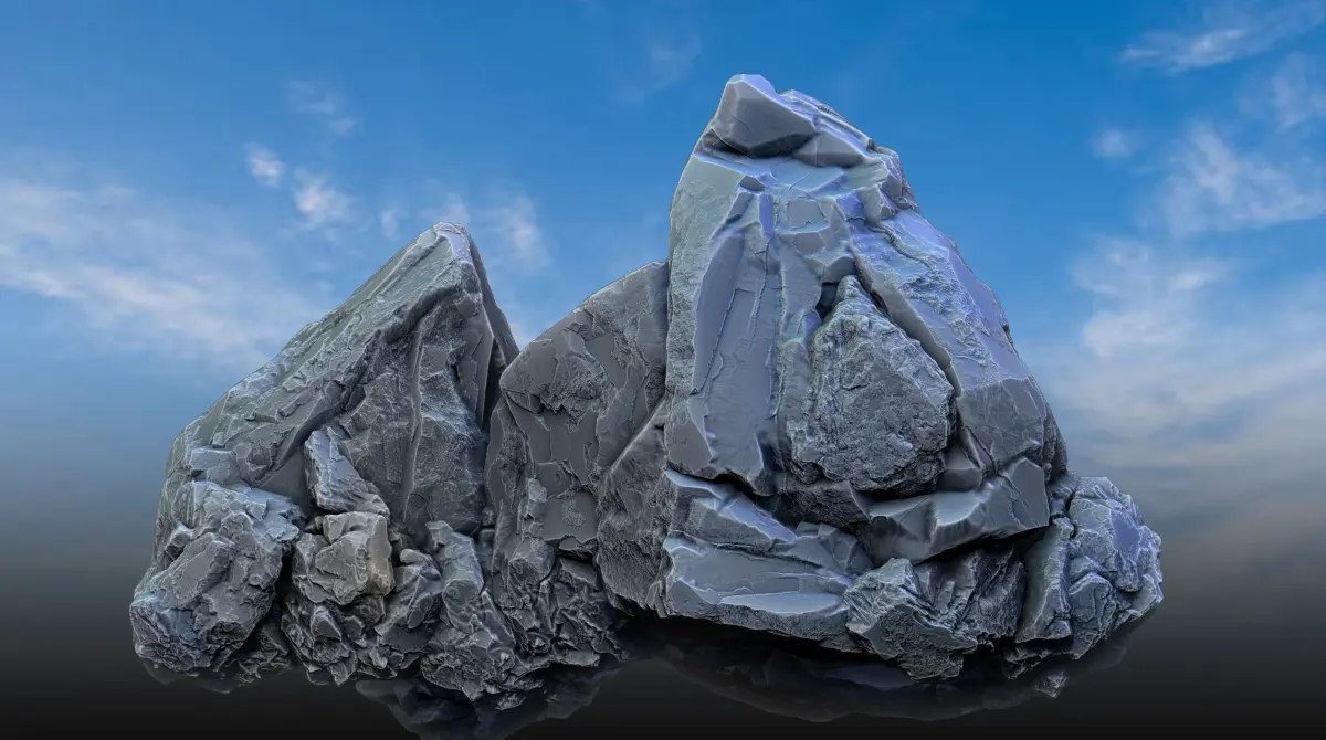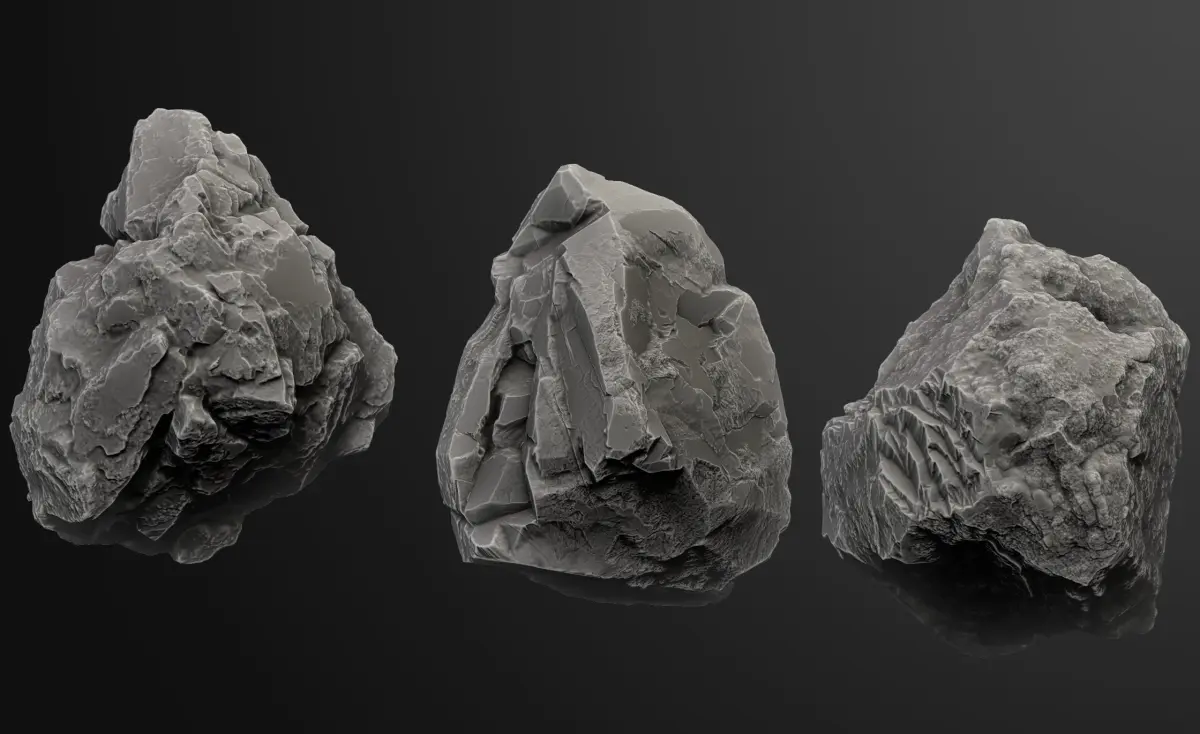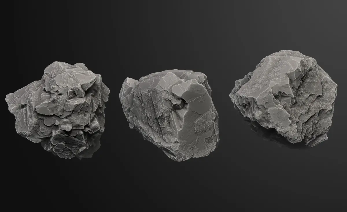 These are three high-poly rock models that you can use in various ways. For reference, you can see a ZBrush render that I’ve uploaded. The models are available in ZTL, FBX, and OBJ formats. Please let me know if you have any questions.