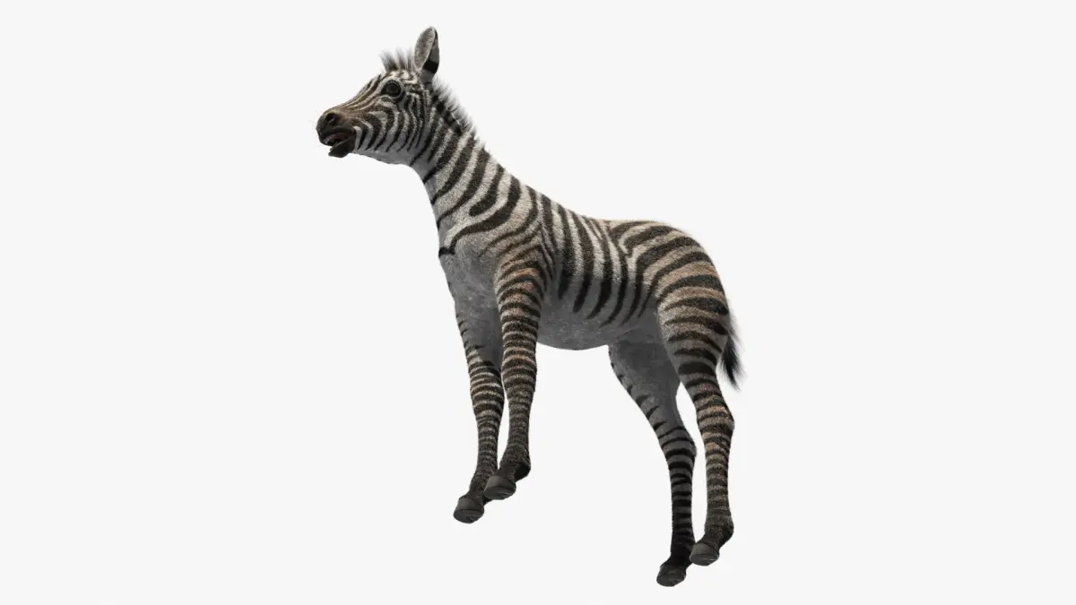 This model showcases the foal's iconic black and white stripes, captured in stunning detail, conveying a lifelike appearance. The realistic fur texture and attentive posture emphasize the beauty and innocence of a young zebra in the wild. The model is optimized for both high-resolution renders and real-time applications.