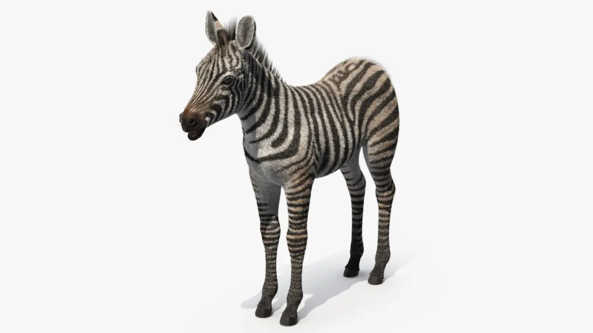 Zebra Adult Foal Fur is a three-dimensional model of a young zebra, beautifully captured to highlight its distinctive features and natural charm.