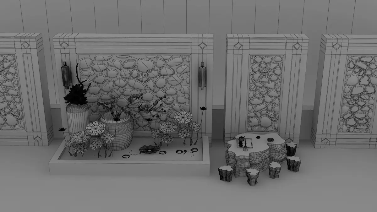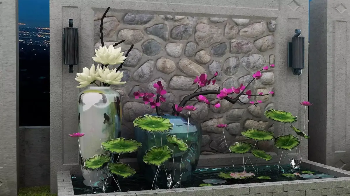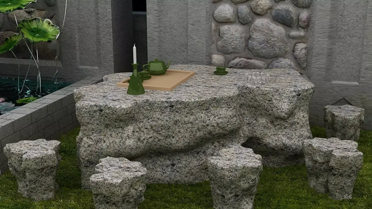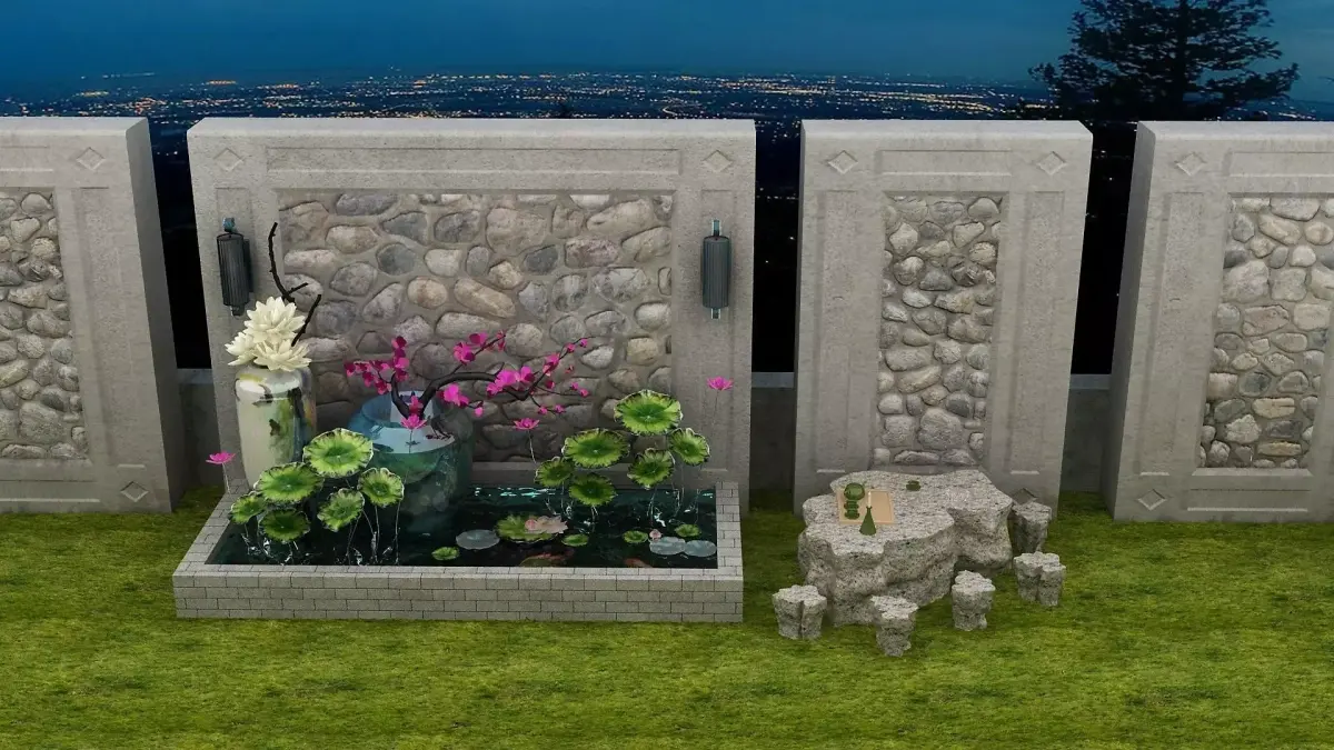 Zen garden set: stone pond, fish, flowers, stone furniture set, vases, rock wall, wall lantern.
