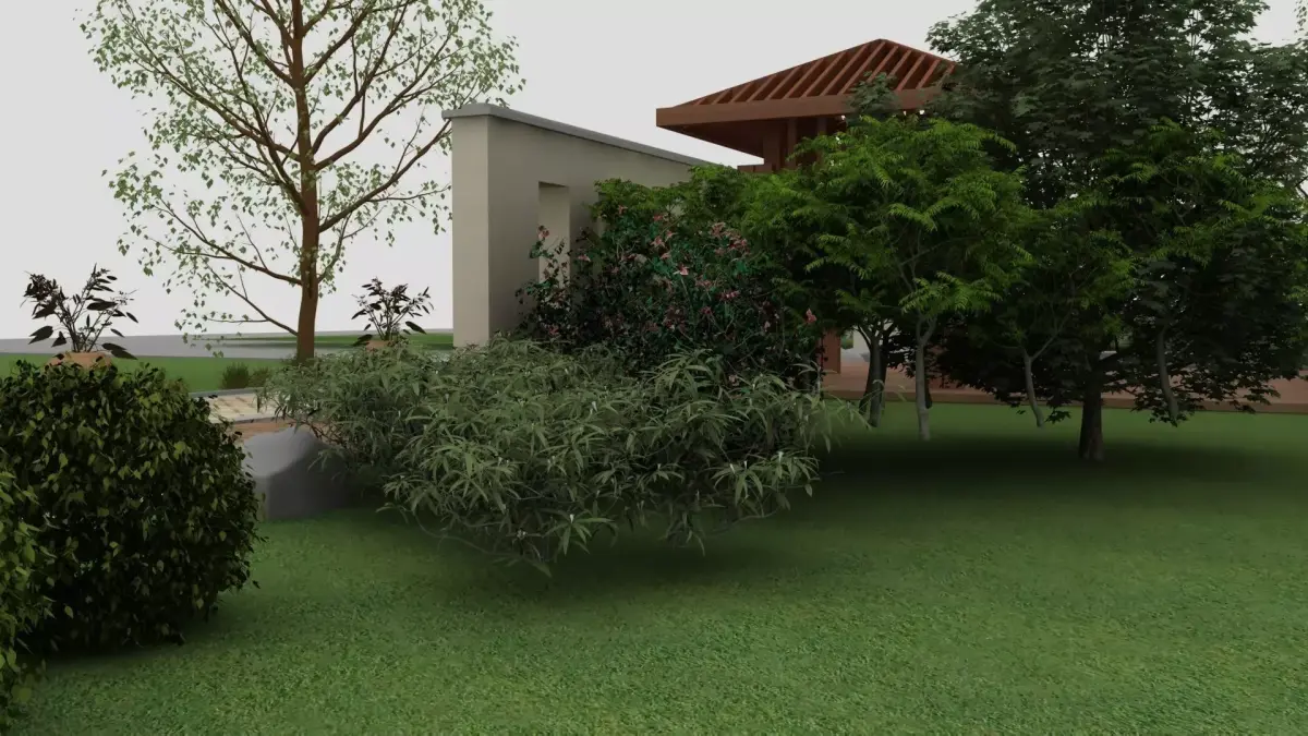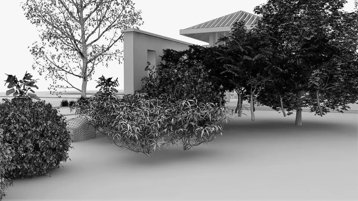 Garden/backyard with artificial pond and greenery.Greenery - 10 vrmesh-files.