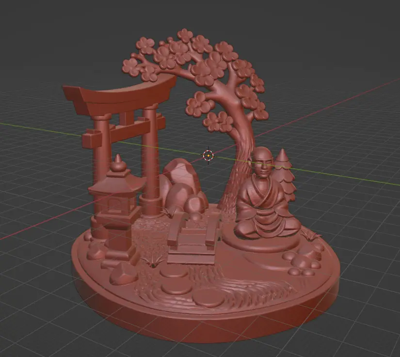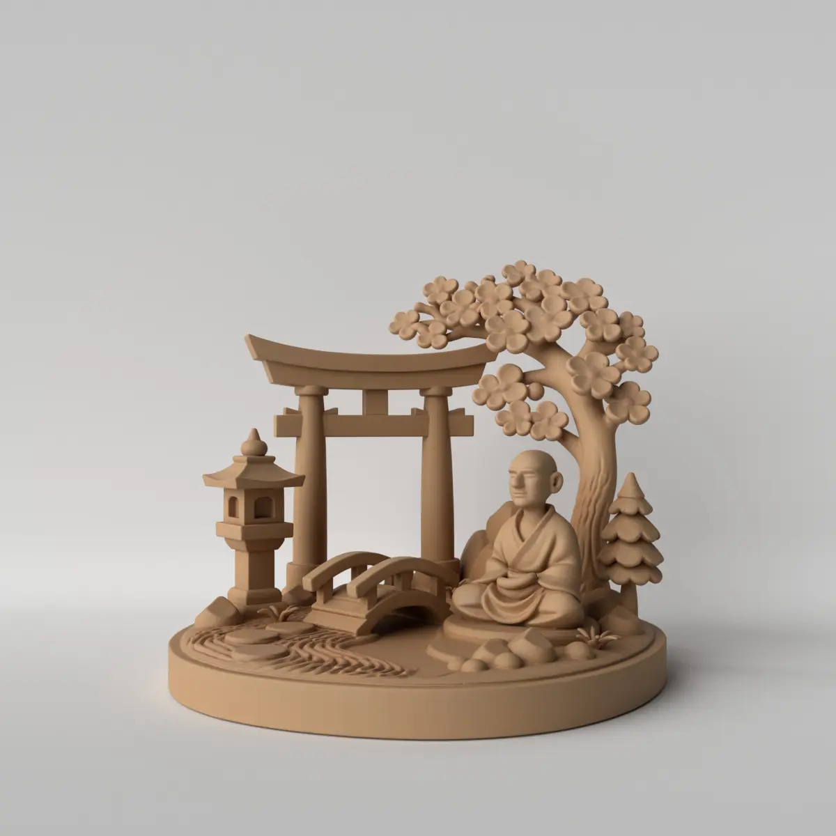 A serene diorama depicting Buddha in a meditation pose, calmly seated in a tranquil zen garden. Elements like stacked stones, lotus leaves, raked sand, and bamboo create a setting of peace and spiritual balance. Ideal for meditation rooms, yoga studios, offices, or as a meaningful decorative piece.