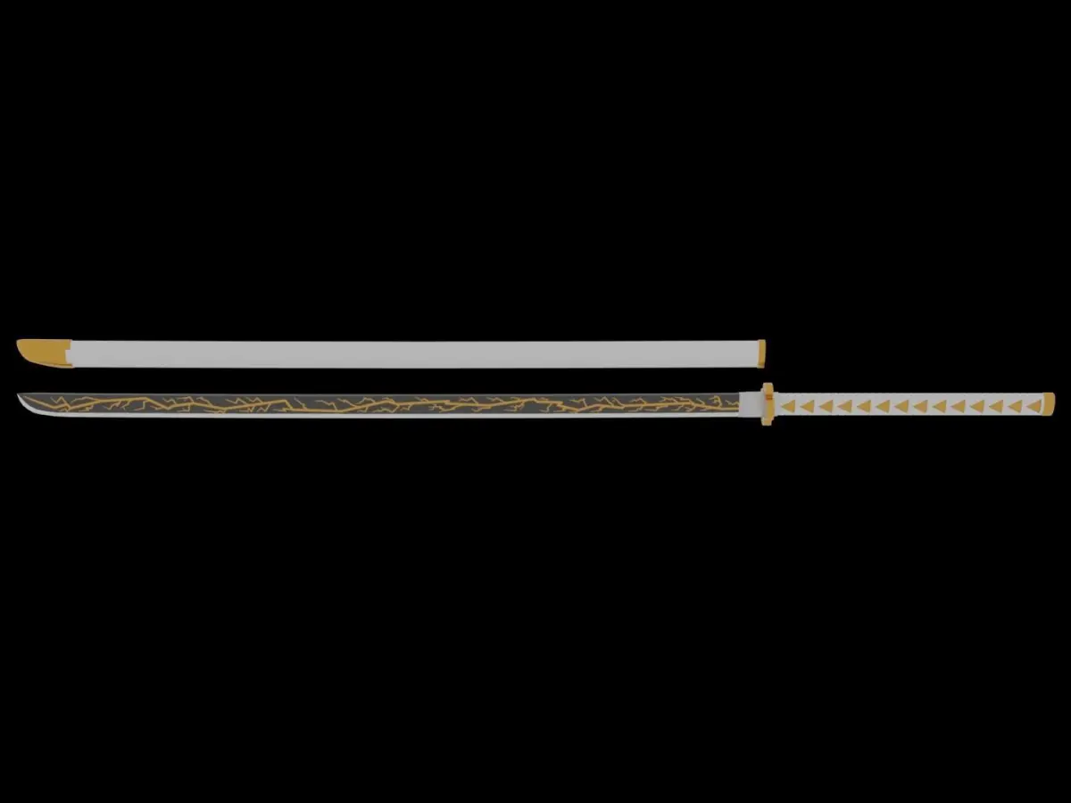 “Zenitsu carries around a standard sized and shaped Nichirin katana with yellow lightning streaks along the entire blade. His sword’s tsuba is circular shaped with 4 slight indentations, the center has a silver tone with small triangles and has a golden border. The handle is yellow and wrapped in white silk ribbon. The base of the handle is gold with two short, white ribbons hanging off it. Along with his katana, Zenitsu also has a standard sword sheath that is white in color.” (https://kimetsu-no-yaiba.fandom.com/wiki/Zenitsu_Agatsuma#Equipment)