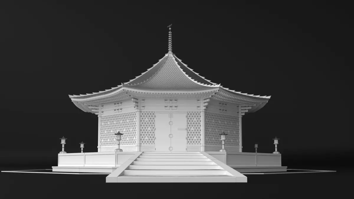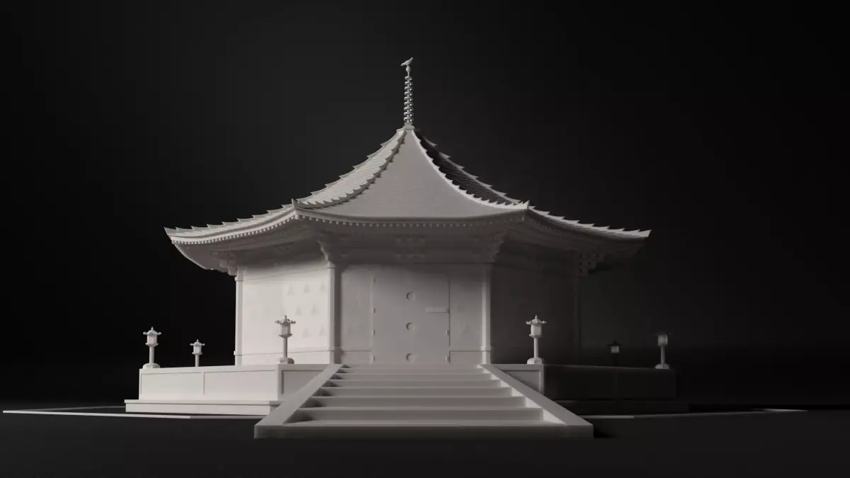 The original architecture design is derived from the Kufukuji buddhist temple in Nara, Japan. The temple in the model is roughly 10 meters high, octogonal floor plan with a 7,5 meters radius.