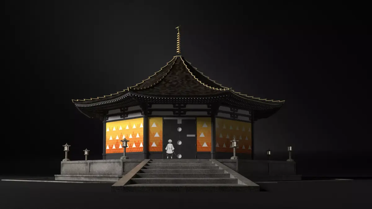 3D model of a japanese temple in tribute to Zenitsu Agatsuma's character on Demon Slayer, from the idea of transforming anime characters into buildings. This would be the first one.Architectural elements of the temple are inspired by the iconography of Zenitsu's character design (color, shapes, lighting).