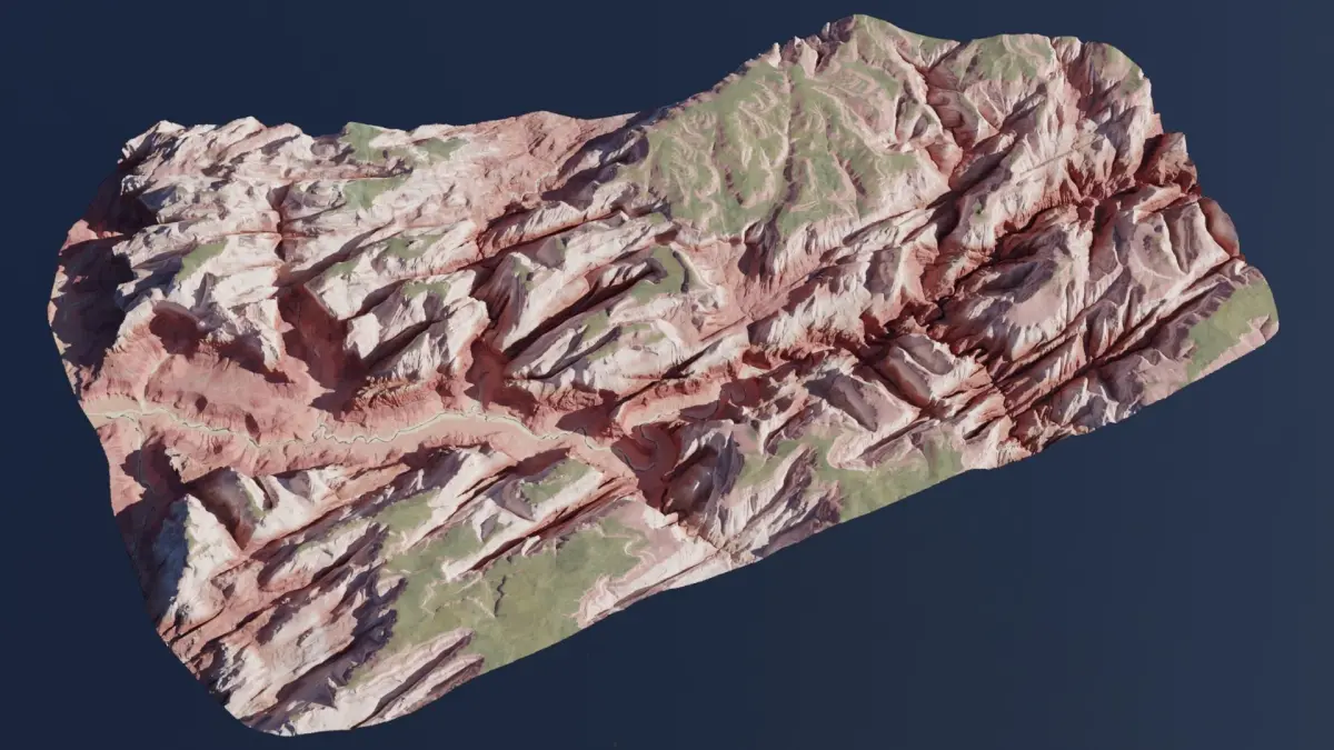 Generated from high resolution elevation data from USGS (3DEP).The textures and vegetation were custom made in World Machine.