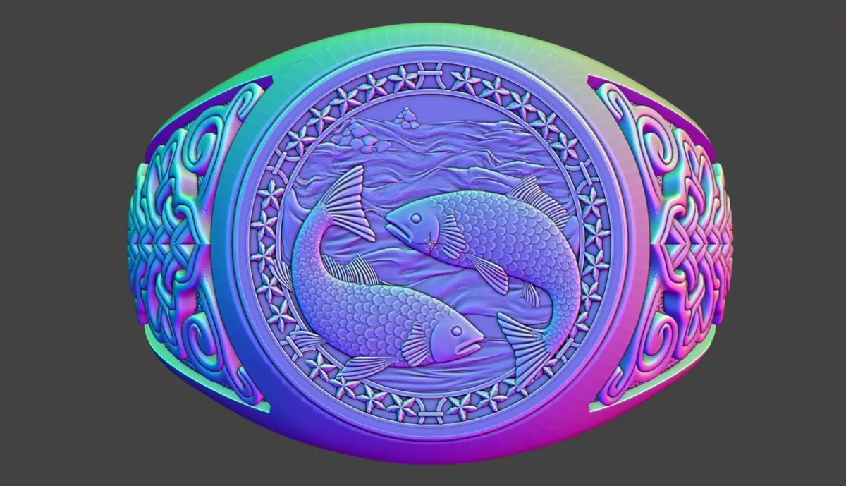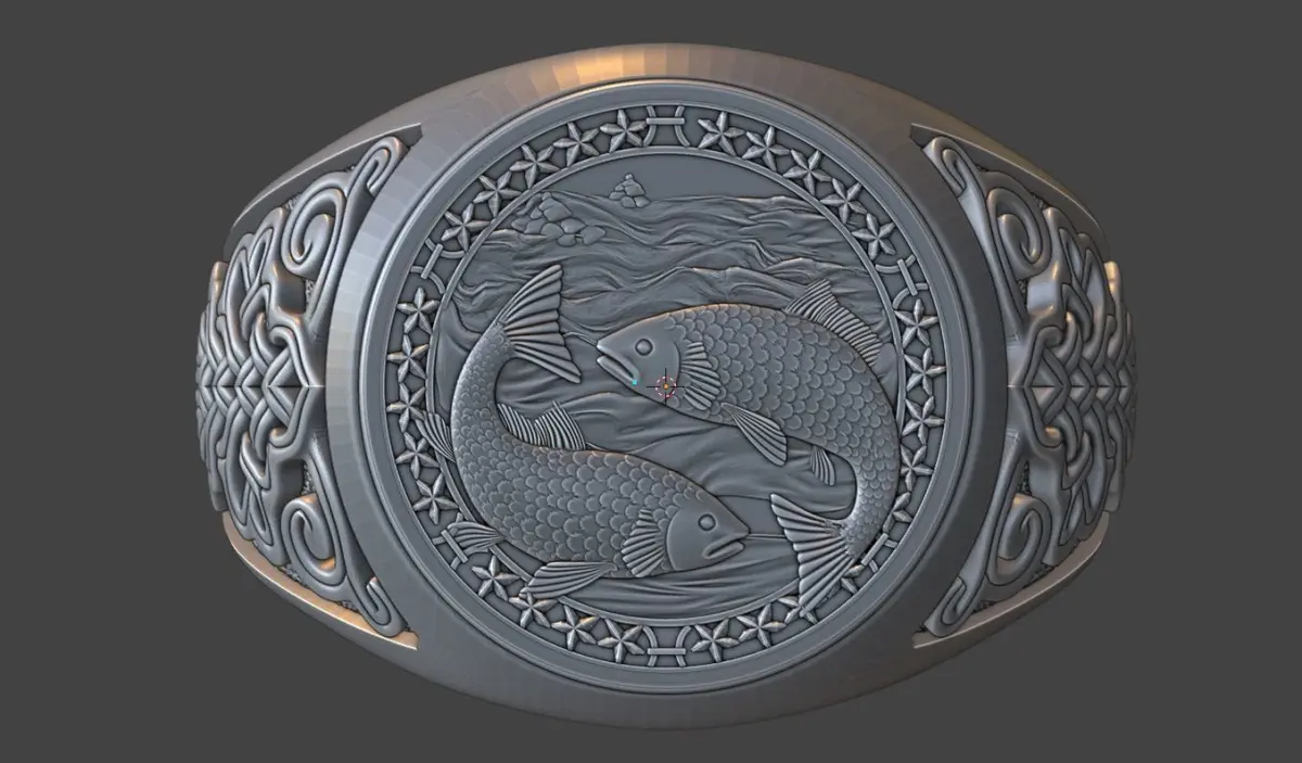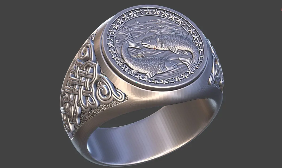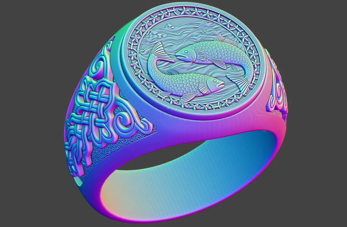 IT IS A PISCES THEMED RING DESIGN, WHICH REPRESENTS THE POWER OF THE HOROSCOPES.DESIGNED AS FISH AND SEA THEMED. IT IS A DESIGN WITH HIGH DETAIL.IT CAN BE SCALED.PRINTABLE.