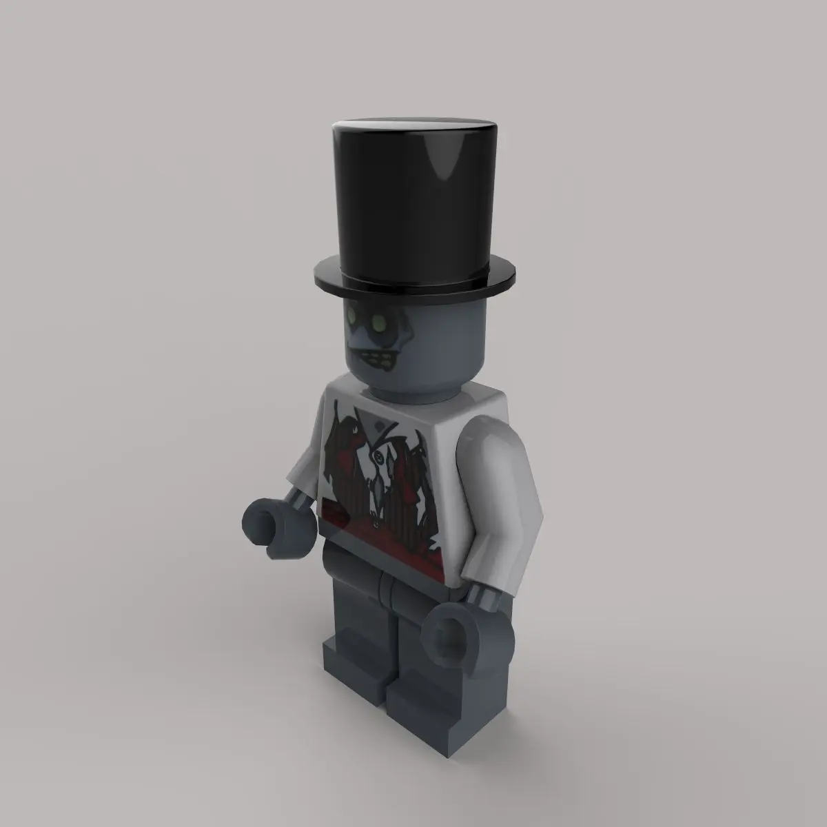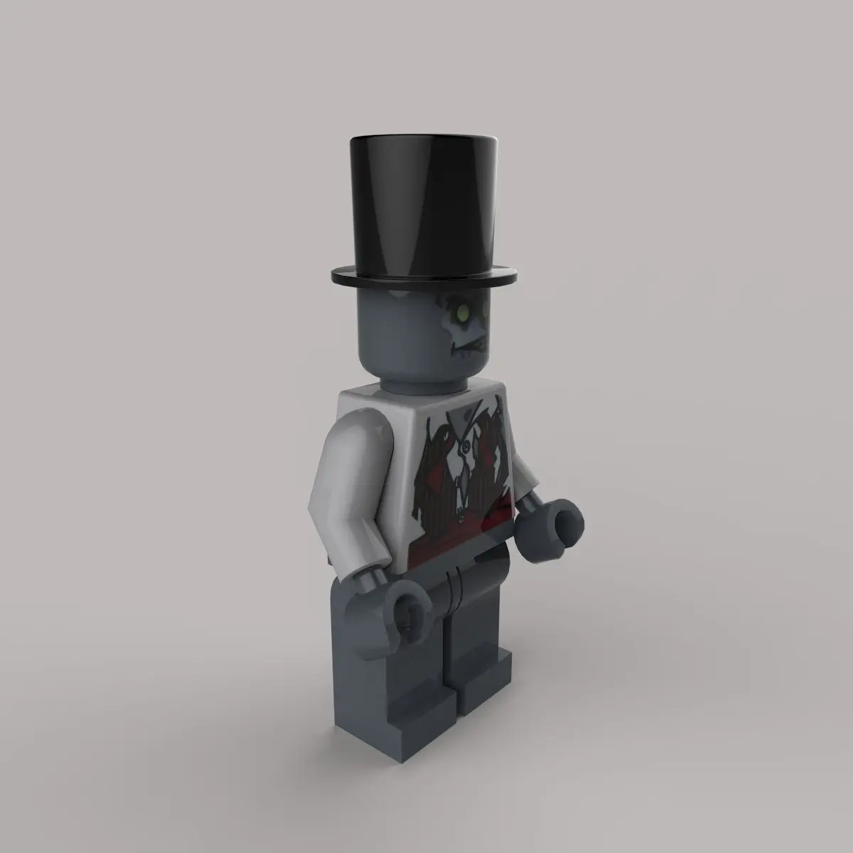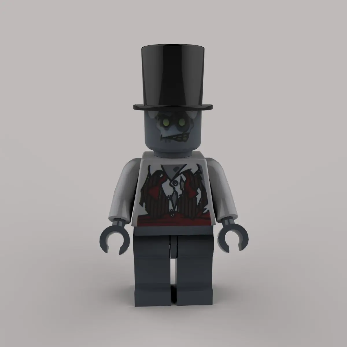 Zombie is a minifigure from 8683 Minifigures Series 1. He has a light grey skin colour and dark grey ripped pants and a shirt with some rips in it. The Zombie also appears in the set 850487 Halloween Accessory Set in a different variation, but the only difference is that the colours of the suit are swapped, which means that the tie is grey and the suit is brown, instead of the inverse.