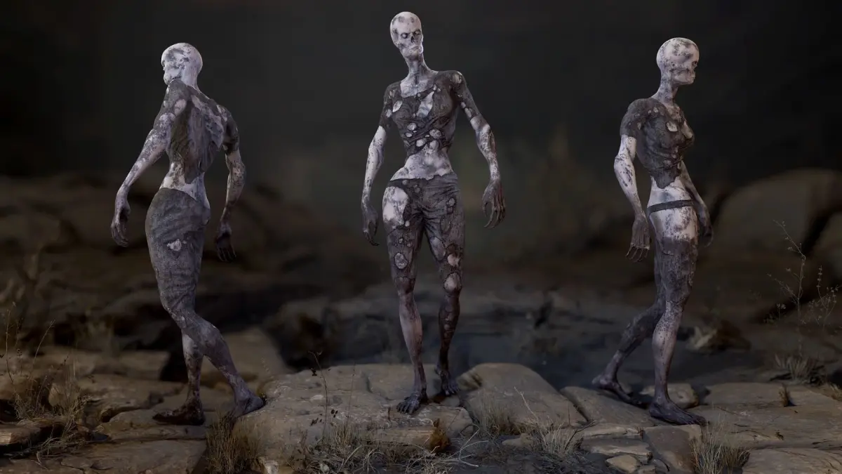 Rigged Zombie Woman with 5 skin variations (Pallid, Dirty, Brown, Bloody and Burnt)