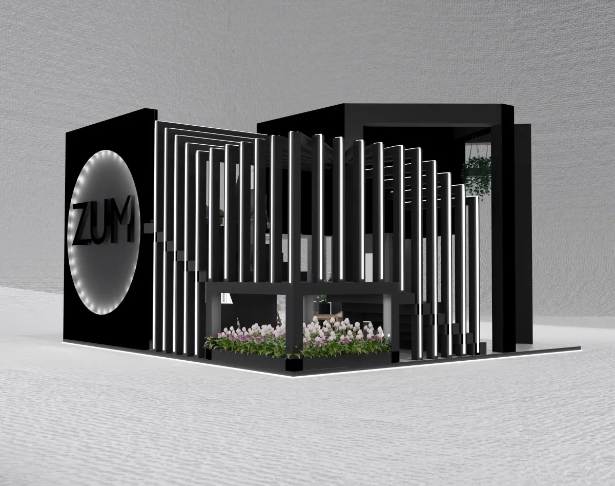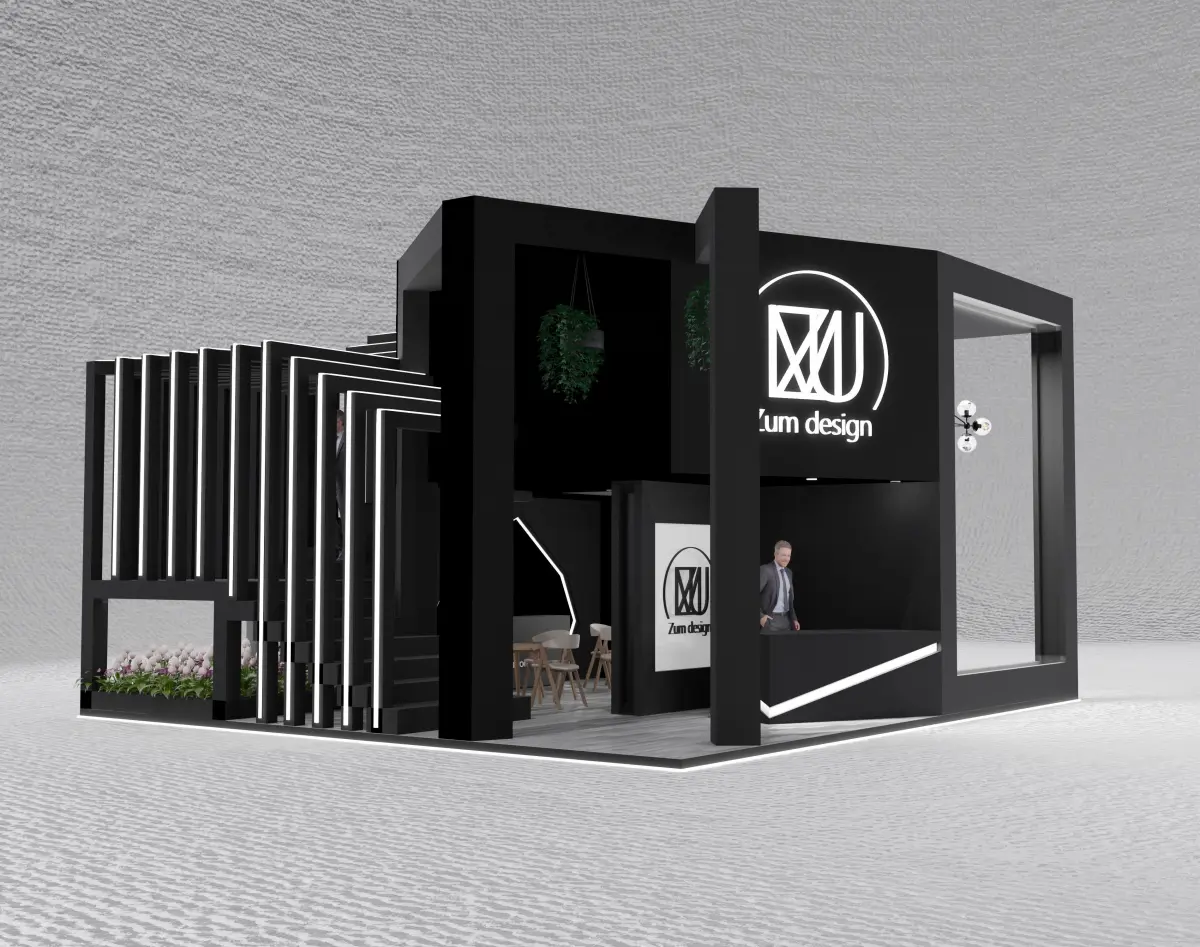 model info (dimensions)length:9 mwidth:8 mheight:5.1 mcolors: blackmaterials:plastic and wood and lightExhibition booth is specialed design from anka 3d city with an attractive and eye catching design